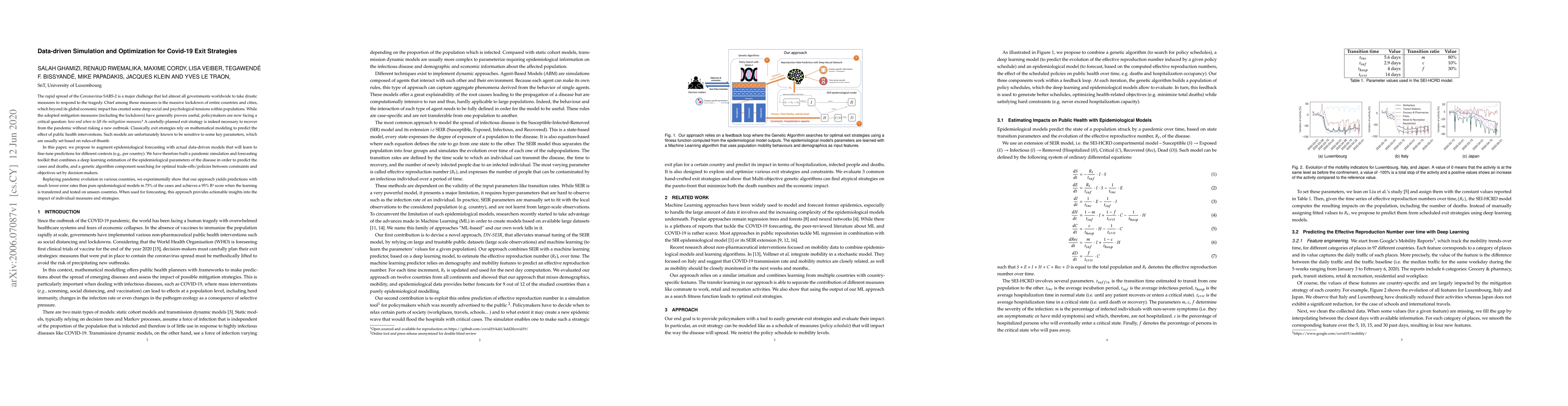 The rapid spread of the Coronavirus SARS-2 is a major challenge that led almost all governments worldwide to take drastic measures to respond to the tragedy. Chief among those measures is the massive lockdown of entire countries and cities, which beyond its global economic impact has created some deep social and psychological tensions within populations. While the adopted mitigation measures (including the lockdown) have generally proven useful, policymakers are now facing a critical question: how and when to lift the mitigation measures? A carefully-planned exit strategy is indeed necessary to recover from the pandemic without risking a new outbreak. Classically, exit strategies rely on mathematical modeling to predict the effect of public health interventions. Such models are unfortunately known to be sensitive to some key parameters, which are usually set based on rules-of-thumb.In this paper, we propose to augment epidemiological forecasting with actual data-driven models that will learn to fine-tune predictions for different contexts (e.g., per country). We have therefore built a pandemic simulation and forecasting toolkit that combines a deep learning estimation of the epidemiological parameters of the disease in order to predict the cases and deaths, and a genetic algorithm component searching for optimal trade-offs/policies between constraints and objectives set by decision-makers. Replaying pandemic evolution in various countries, we experimentally show that our approach yields predictions with much lower error rates than pure epidemiological models in 75% of the cases and achieves a 95% R2 score when the learning is transferred and tested on unseen countries. When used for forecasting, this approach provides actionable insights into the impact of individual measures and strategies.