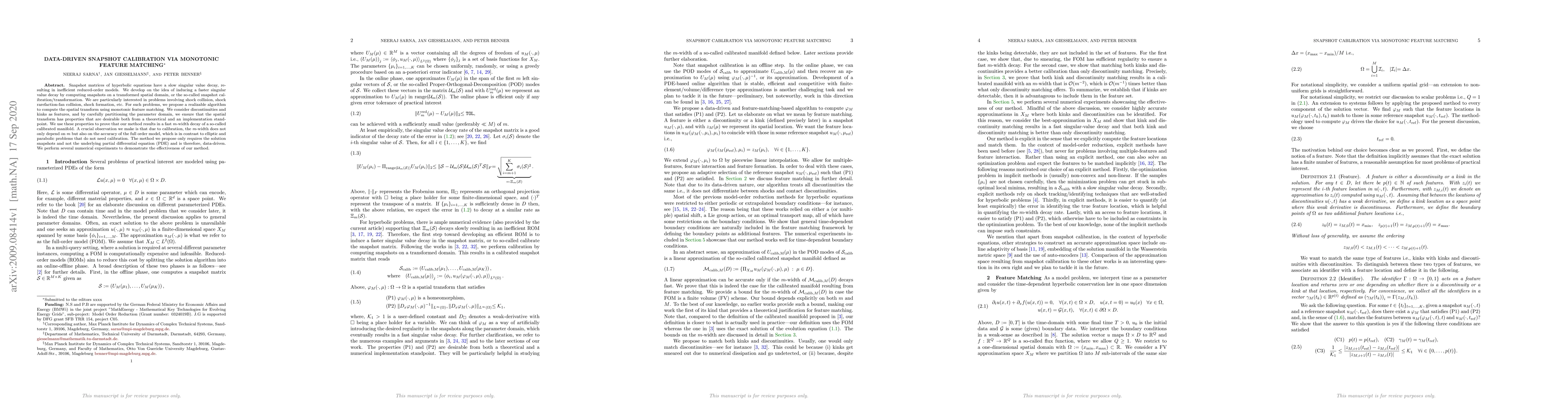 This research introduces a data-driven method for snapshot calibration in hyperbolic equations, using monotonic feature matching to induce faster singular value decay. The proposed algorithm is realizable, considers discontinuities and kinks, and only requires solution snapshots, making it applicable and efficient for complex problems involving shock collisions, rarefactions, and formations.
