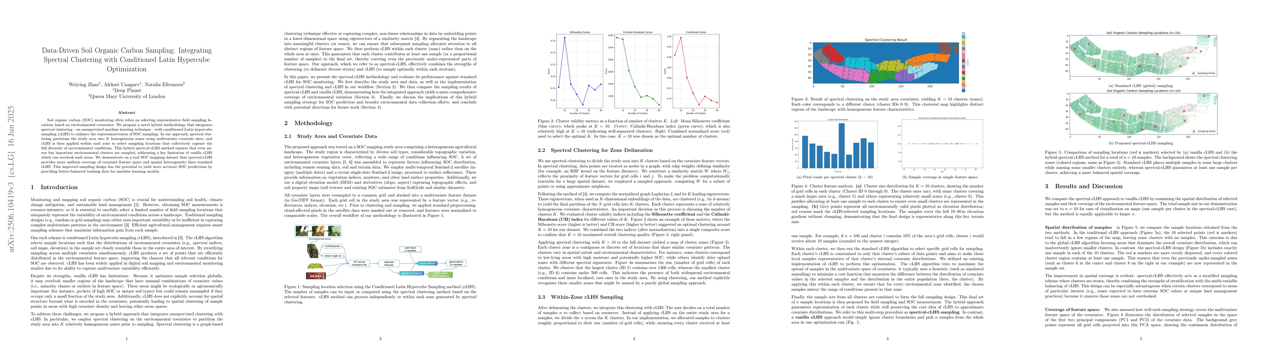 Soil organic carbon (SOC) monitoring often relies on selecting representative field sampling locations based on environmental covariates. We propose a novel hybrid methodology that integrates spectral clustering - an unsupervised machine learning technique with conditioned Latin hypercube sampling (cLHS) to enhance the representativeness of SOC sampling. In our approach, spectral clustering partitions the study area into $K$ homogeneous zones using multivariate covariate data, and cLHS is then applied within each zone to select sampling locations that collectively capture the full diversity of environmental conditions. This hybrid spectral-cLHS method ensures that even minor but important environmental clusters are sampled, addressing a key limitation of vanilla cLHS which can overlook such areas. We demonstrate on a real SOC mapping dataset that spectral-cLHS provides more uniform coverage of covariate feature space and spatial heterogeneity than standard cLHS. This improved sampling design has the potential to yield more accurate SOC predictions by providing better-balanced training data for machine learning models.