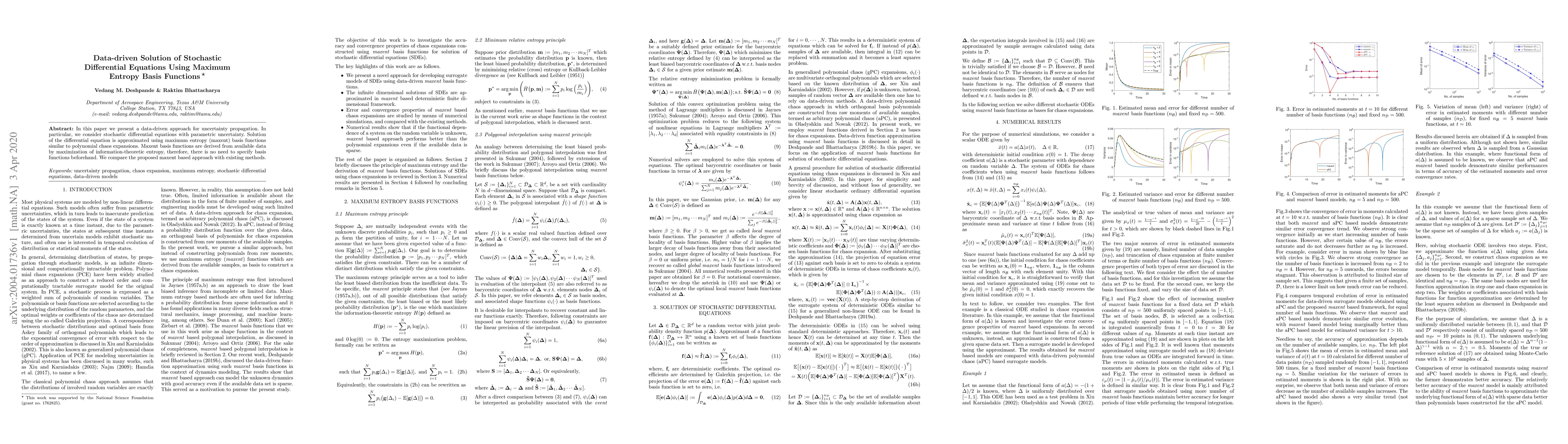 This paper proposes a data-driven method for solving stochastic differential equations using maximum entropy basis functions, which are derived directly from data to approximate solutions without predefined basis functions. The method is compared with other existing techniques for uncertainty propagation.