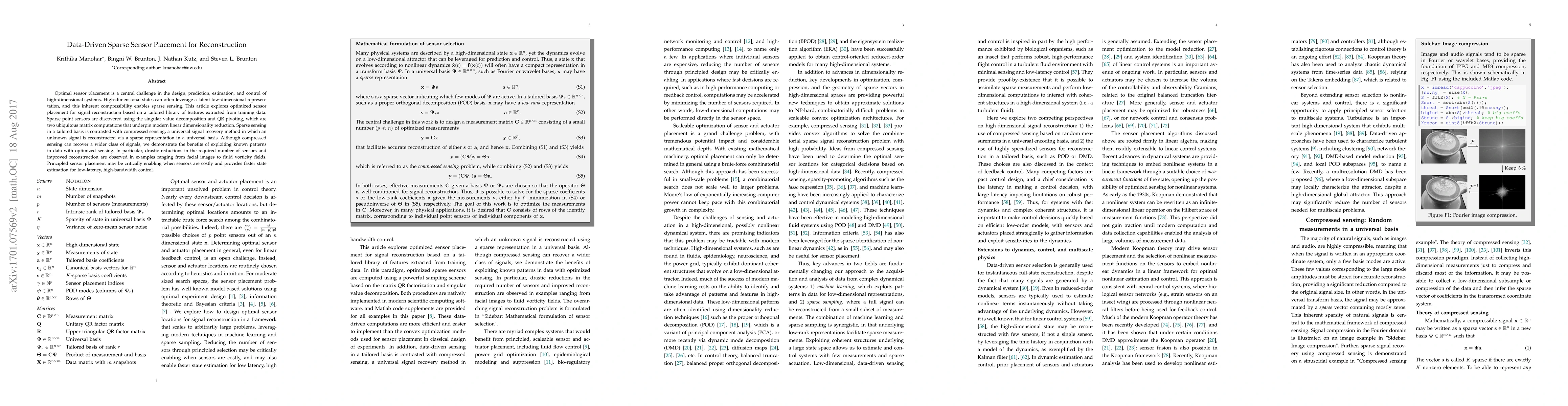 This paper investigates optimized sparse sensor placement for signal reconstruction using tailored features from training data, leveraging matrix computations like singular value decomposition and QR pivoting. It demonstrates significant reductions in sensor count and improved reconstruction accuracy compared to compressed sensing, especially in applications like facial images and fluid dynamics.