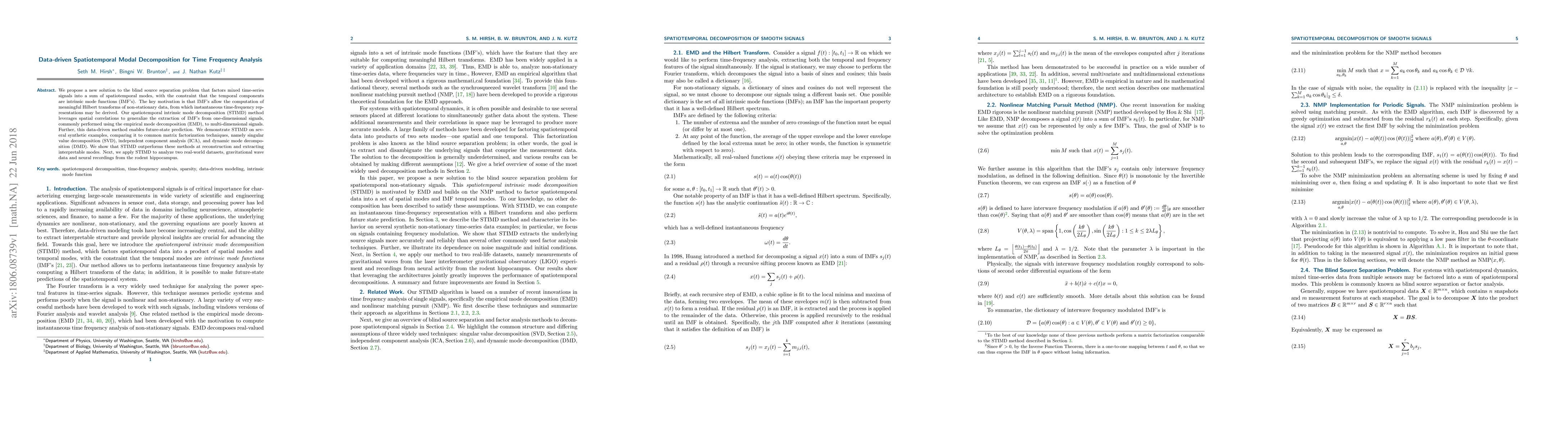This paper introduces a spatiotemporal intrinsic mode decomposition (STIMD) method for blind source separation, factoring mixed time-series into intrinsic mode functions (IMFs) for meaningful time-frequency analysis. STIMD leverages spatial correlations to extend IMF extraction to multi-dimensional signals, outperforming SVD, ICA, and DMD in reconstruction and interpretability, as demonstrated on synthetic, gravitational wave, and neural datasets.