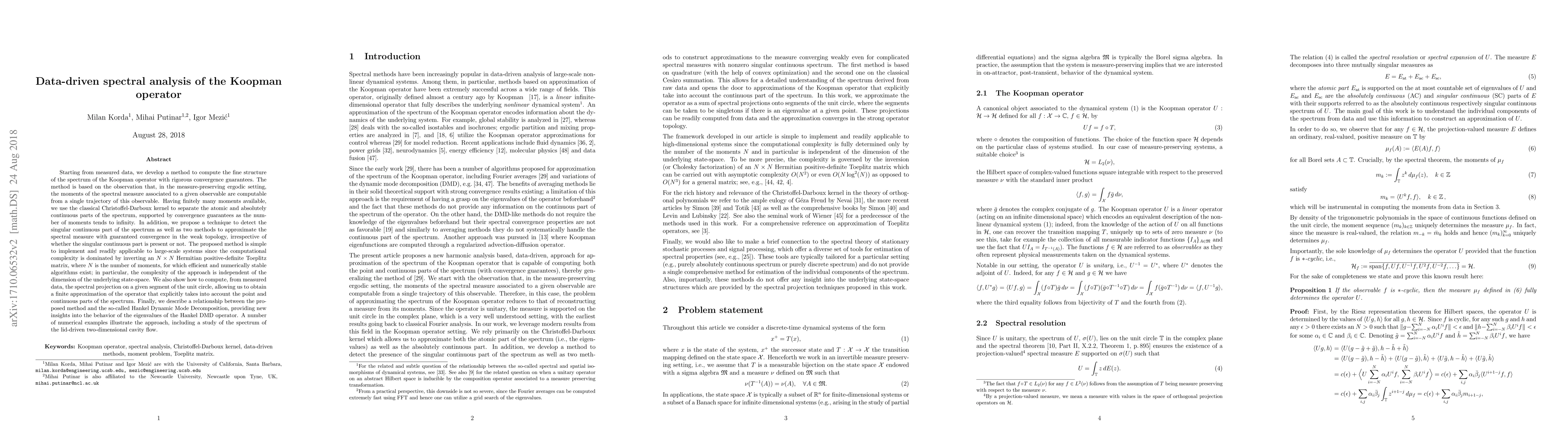 The paper introduces a novel data-driven approach for spectral analysis of the Koopman operator, providing rigorous convergence guarantees and methods for approximating spectral measures.