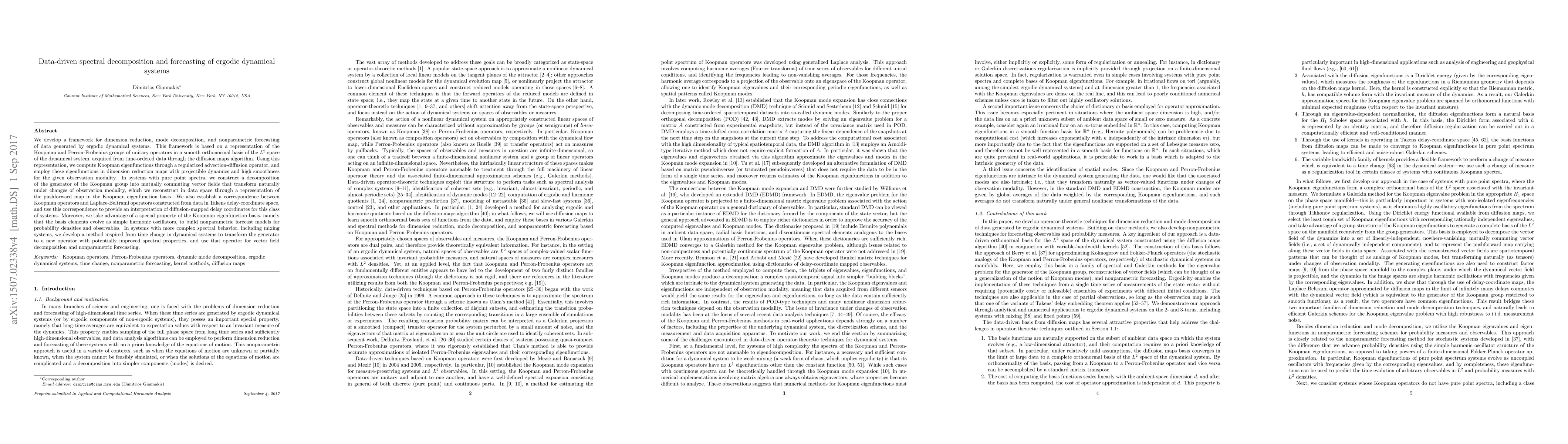 This paper presents a data-driven framework for dimension reduction and forecasting of ergodic dynamical systems using Koopman operator theory. It employs diffusion maps to represent Koopman eigenfunctions and constructs forecasting models based on their harmonic oscillator properties.