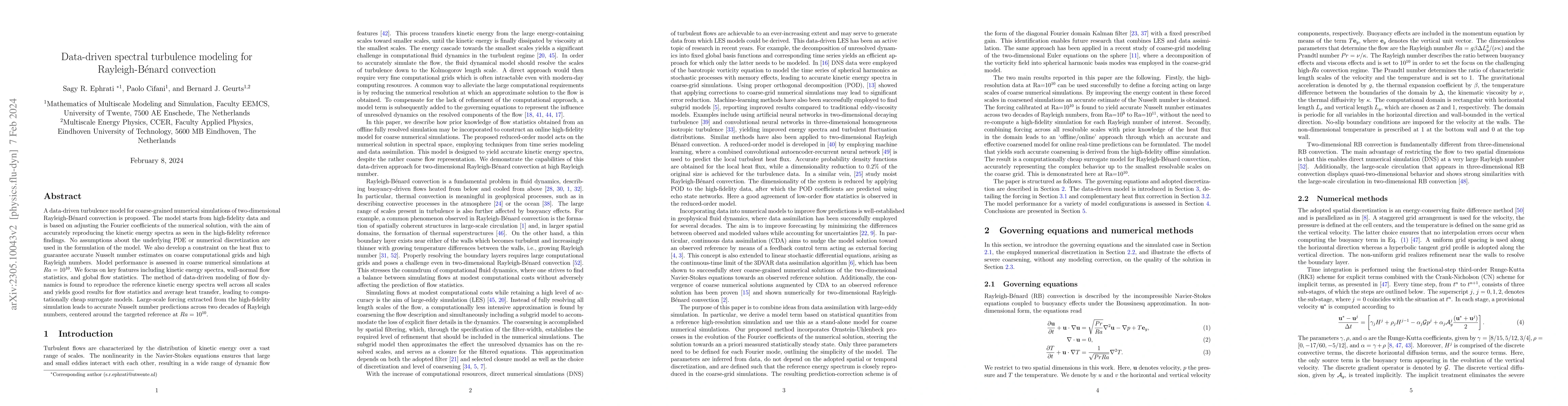 A data-driven turbulence model for coarse-grained numerical simulations of two-dimensional Rayleigh-B\'enard convection is proposed. The model starts from high-fidelity data and is based on adjusting the Fourier coefficients of the numerical solution, with the aim of accurately reproducing the kinetic energy spectra as seen in the high-fidelity reference findings. No assumptions about the underlying PDE or numerical discretization are used in the formulation of the model. We also develop a constraint on the heat flux to guarantee accurate Nusselt number estimates on coarse computational grids and high Rayleigh numbers. Model performance is assessed in coarse numerical simulations at $Ra=10^{10}$. We focus on key features including kinetic energy spectra, wall-normal flow statistics, and global flow statistics. The method of data-driven modeling of flow dynamics is found to reproduce the reference kinetic energy spectra well across all scales and yields good results for flow statistics and average heat transfer, leading to computationally cheap surrogate models. Large-scale forcing extracted from the high-fidelity simulation leads to accurate Nusselt number predictions across two decades of Rayleigh numbers, centered around the targeted reference at $Ra=10^{10}$.