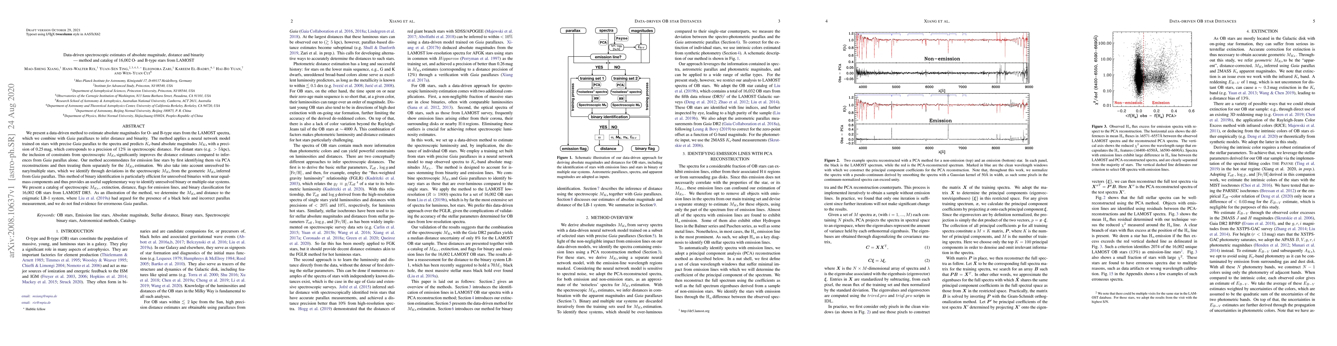 This research introduces a data-driven method using neural networks to estimate absolute magnitudes, distances, and identify binarity in O- and B-type stars from LAMOST spectra. The method, validated with Gaia parallaxes, achieves a precision of 12% in spectroscopic distances. It effectively handles emission line stars and unresolved binaries, presenting a catalog of 16,002 OB stars' properties from LAMOST DR5. The approach accurately determines the properties of the enigmatic LB-1 system, finding no evidence for incorrect Gaia parallax as previously suggested.