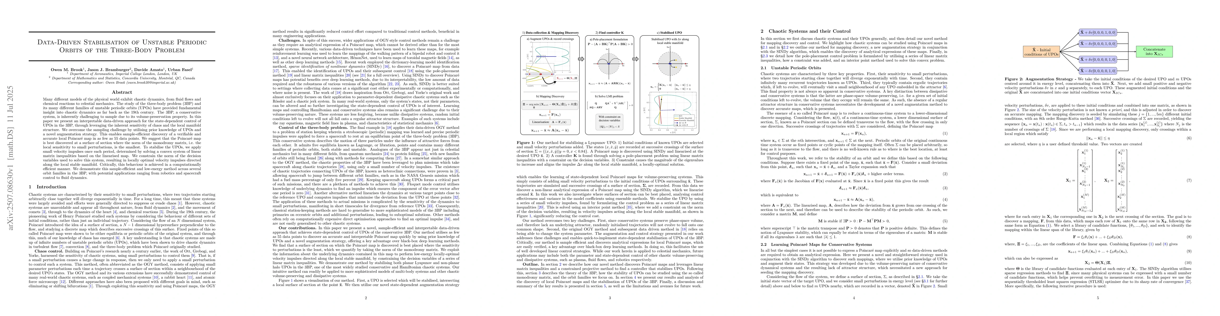 Many different models of the physical world exhibit chaotic dynamics, from fluid flows and chemical reactions to celestial mechanics. The study of the three-body problem (3BP) and its many different families of unstable periodic orbits (UPOs) have provided fundamental insight into chaotic dynamics as far back as the 19th century. The 3BP, a conservative system, is inherently challenging to sample due to its volume-preservation property. In this paper we present an interpretable data-driven approach for the state-dependent control of UPOs in the 3BP, through leveraging the inherent sensitivity of chaos and the local manifold structure. We overcome the sampling challenge by utilising prior knowledge of UPOs and a novel augmentation strategy. This enables sample-efficient discovery of a verifiable and accurate local Poincar\'{e} map in as few as 55 data points. We suggest that the Poincar\'{e} map is best discovered at a surface of section where the norm of the monodromy matrix, i.e. the local sensitivity to small perturbations, is the smallest. To stabilise the UPOs, we apply small velocity impulses once each period, determined by solving a convex system of linear matrix inequalities based on the linearised map. We constrain the norm of the decision variables used to solve this system, resulting in locally optimal velocity impulses directed along the local stable manifold. Critically, this behaviour is achieved in a computationally efficient manner. We demonstrate this sample-efficient and low-energy method across several orbit families in the 3BP, with potential applications ranging from robotics and spacecraft control to fluid dynamics.