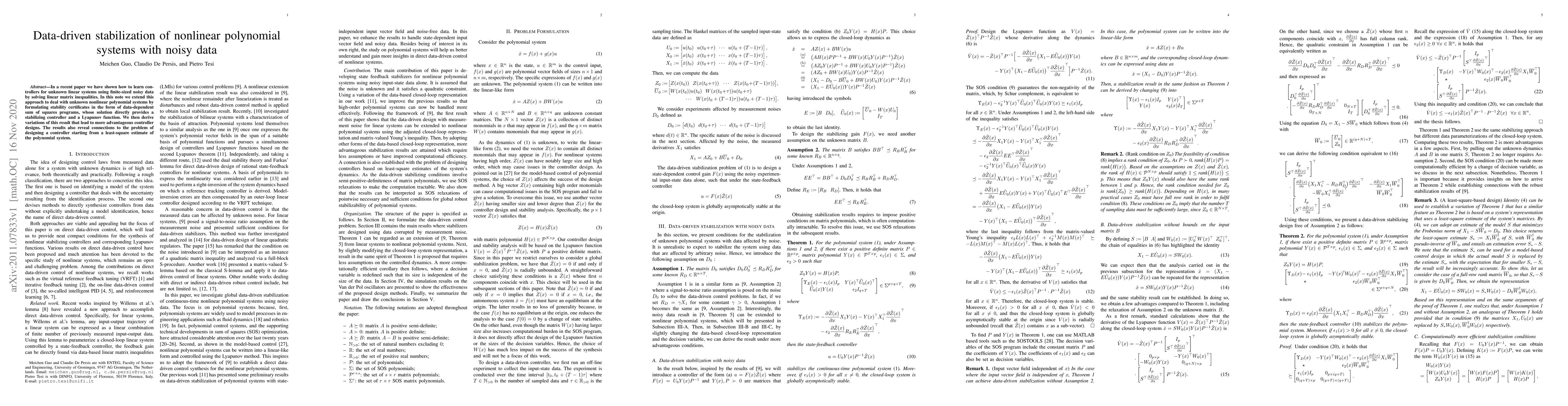 In a recent paper we have shown how to learn controllers for unknown linear systems using finite-sized noisy data by solving linear matrix inequalities. In this note we extend this approach to deal with unknown nonlinear polynomial systems by formulating stability certificates in the form of data-dependent sum of squares programs, whose solution directly provides a stabilizing controller and a Lyapunov function. We then derive variations of this result that lead to more advantageous controller designs. The results also reveal connections to the problem of designing a controller starting from a least-square estimate of the polynomial system.