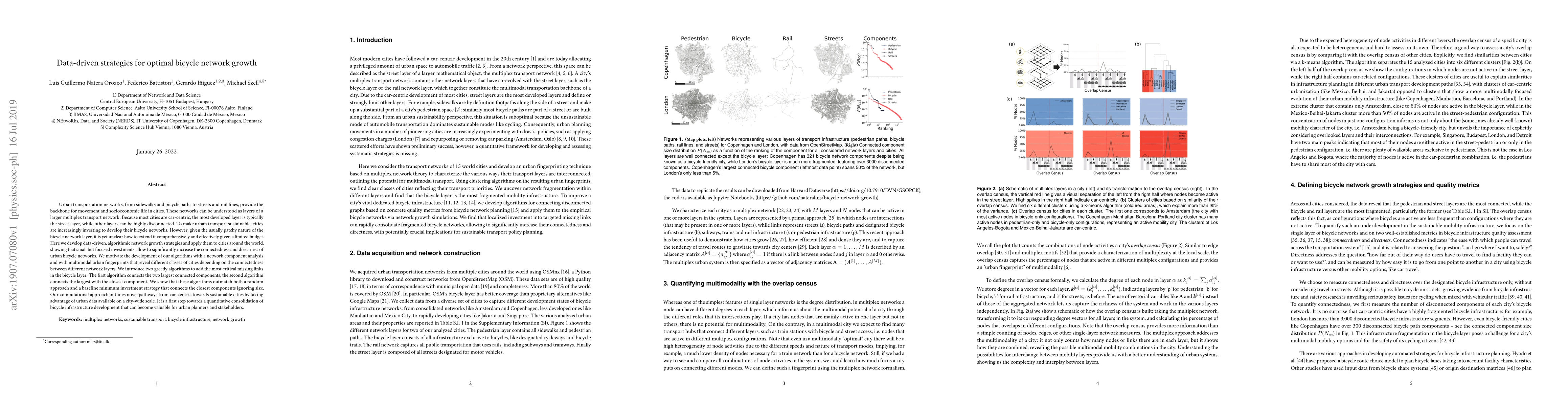 Urban transportation networks, from sidewalks and bicycle paths to streets and rail lines, provide the backbone for movement and socioeconomic life in cities. These networks can be understood as layers of a larger multiplex transport network. Because most cities are car-centric, the most developed layer is typically the street layer, while other layers can be highly disconnected. To make urban transport sustainable, cities are increasingly investing to develop their bicycle networks. However, given the usually patchy nature of the bicycle network layer, it is yet unclear how to extend it comprehensively and effectively given a limited budget. Here we develop data-driven, algorithmic network growth strategies and apply them to cities around the world, showing that small but focused investments allow to significantly increase the connectedness and directness of urban bicycle networks. We motivate the development of our algorithms with a network component analysis and with multimodal urban fingerprints that reveal different classes of cities depending on the connectedness between different network layers. We introduce two greedy algorithms to add the most critical missing links in the bicycle layer: The first algorithm connects the two largest connected components, the second algorithm connects the largest with the closest component. We show that these algorithms outmatch both a random approach and a baseline minimum investment strategy that connects the closest components ignoring size. Our computational approach outlines novel pathways from car-centric towards sustainable cities by taking advantage of urban data available on a city-wide scale. It is a first step towards a quantitative consolidation of bicycle infrastructure development that can become valuable for urban planners and stakeholders.