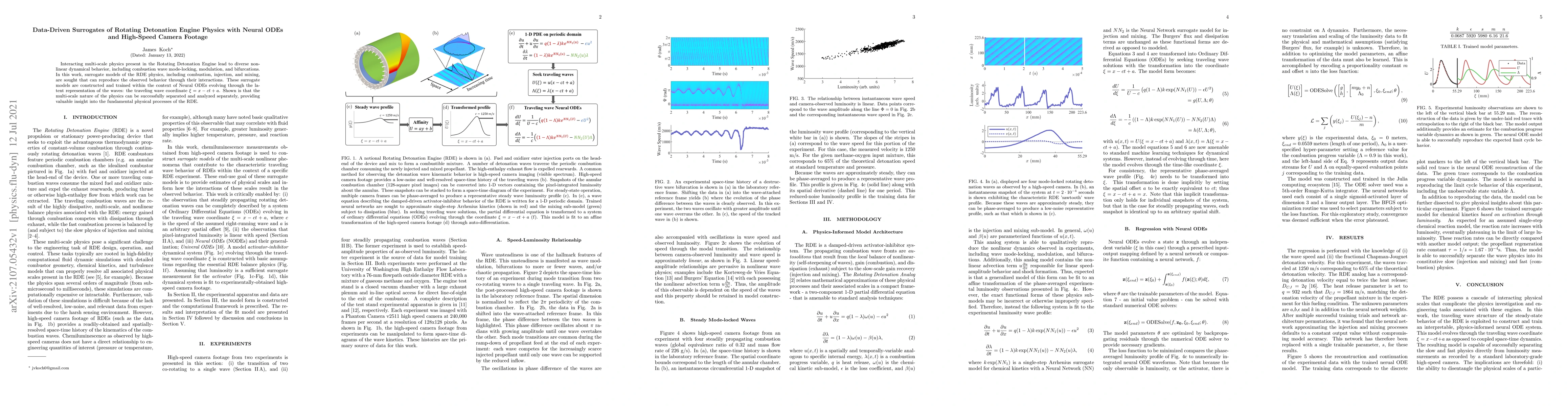 This paper develops neural ordinary differential equations (ODEs) to create surrogate models for the complex physics of Rotating Detonation Engines (RDE), capturing nonlinear dynamics like combustion wave mode-locking. The models are trained using high-speed camera footage and traveling wave coordinates, successfully separating and analyzing multi-scale physical interactions.