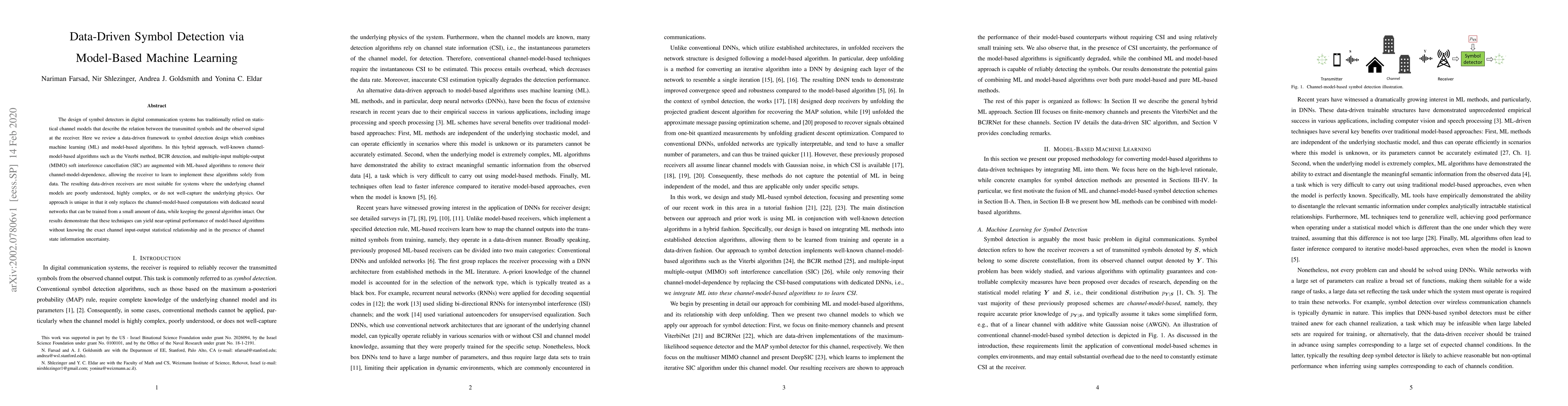 This paper proposes a data-driven framework for symbol detection in digital communication systems, combining machine learning with traditional model-based algorithms to reduce channel-model dependence. The hybrid approach trains neural networks to replace model-based computations, achieving near-optimal performance without precise channel knowledge.