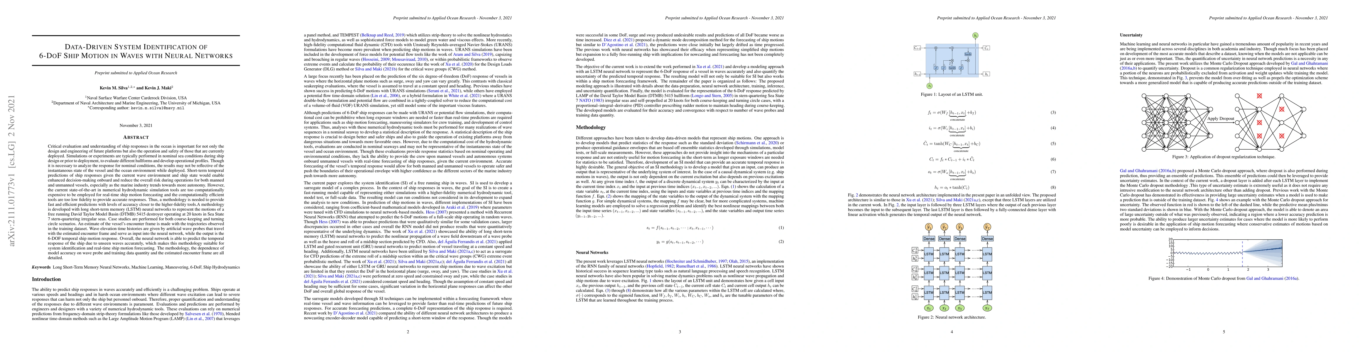 This paper develops a long short-term memory (LSTM) neural network methodology to accurately predict the 6-DOF temporal ship motion responses in irregular seas, enabling real-time forecasting for enhanced decision-making. The model demonstrates high accuracy in both course-keeping and turning circle scenarios, highlighting its potential for system identification and operational safety.