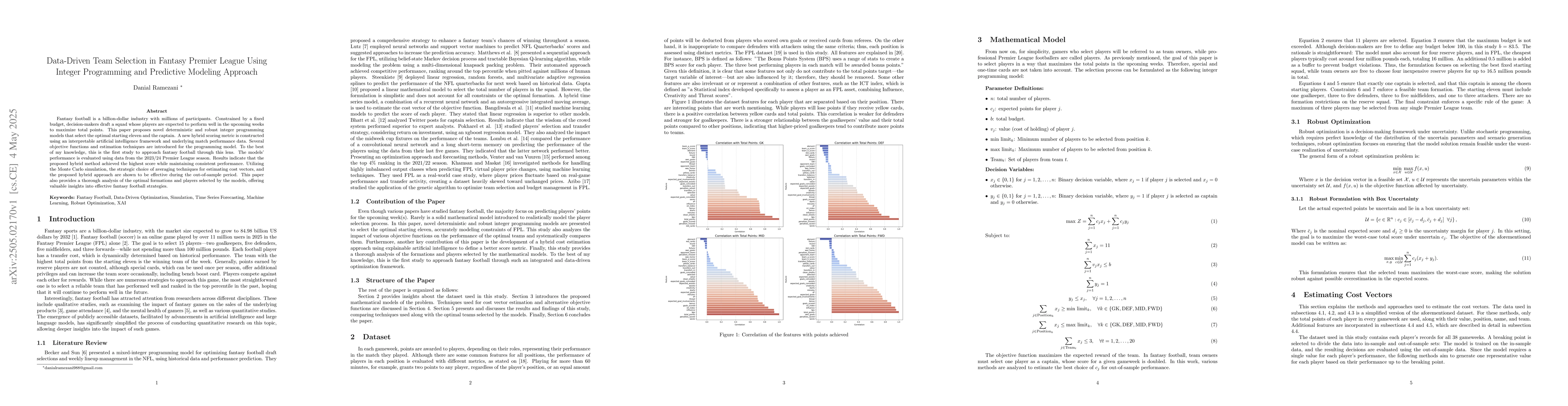 Fantasy football is a billion-dollar industry with millions of participants. Constrained by a fixed budget, decision-makers draft a squad whose players are expected to perform well in the upcoming weeks to maximize total points. This paper proposes novel deterministic and robust integer programming models that select the optimal starting eleven and the captain. A new hybrid scoring metric is constructed using an interpretable artificial intelligence framework and underlying match performance data. Several objective functions and estimation techniques are introduced for the programming model. To the best of my knowledge, this is the first study to approach fantasy football through this lens. The models' performance is evaluated using data from the 2023/24 Premier League season. Results indicate that the proposed hybrid method achieved the highest score while maintaining consistent performance. Utilizing the Monte Carlo simulation, the strategic choice of averaging techniques for estimating cost vectors, and the proposed hybrid approach are shown to be effective during the out-of-sample period. This paper also provides a thorough analysis of the optimal formations and players selected by the models, offering valuable insights into effective fantasy football strategies.