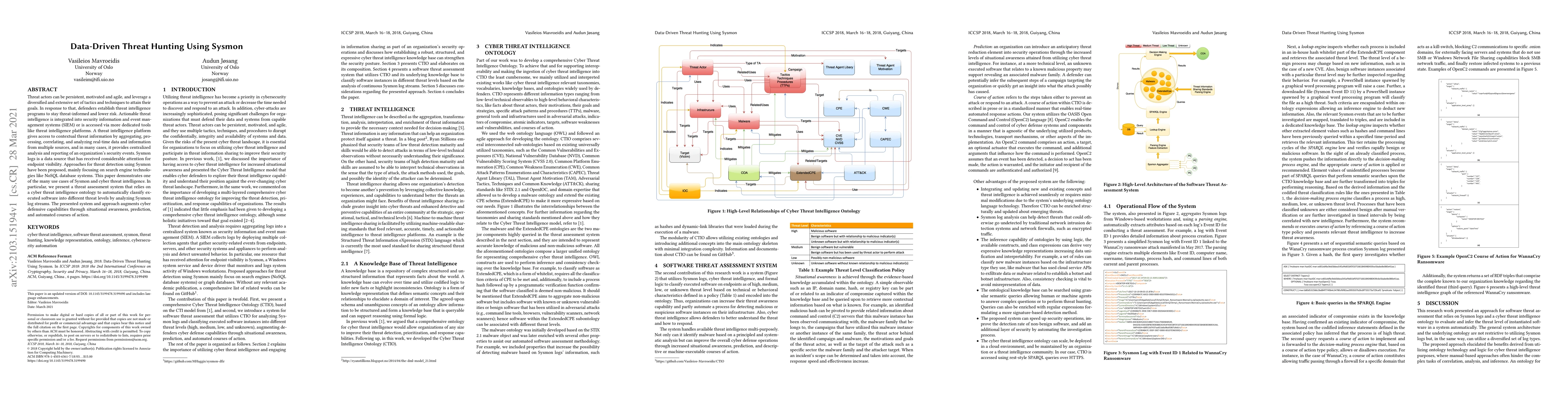 This paper presents a threat assessment system that uses Sysmon logs and cyber threat intelligence to automatically classify executed software based on threat levels, enhancing defensive capabilities through improved situational awareness, predictive analytics, and automated response strategies.