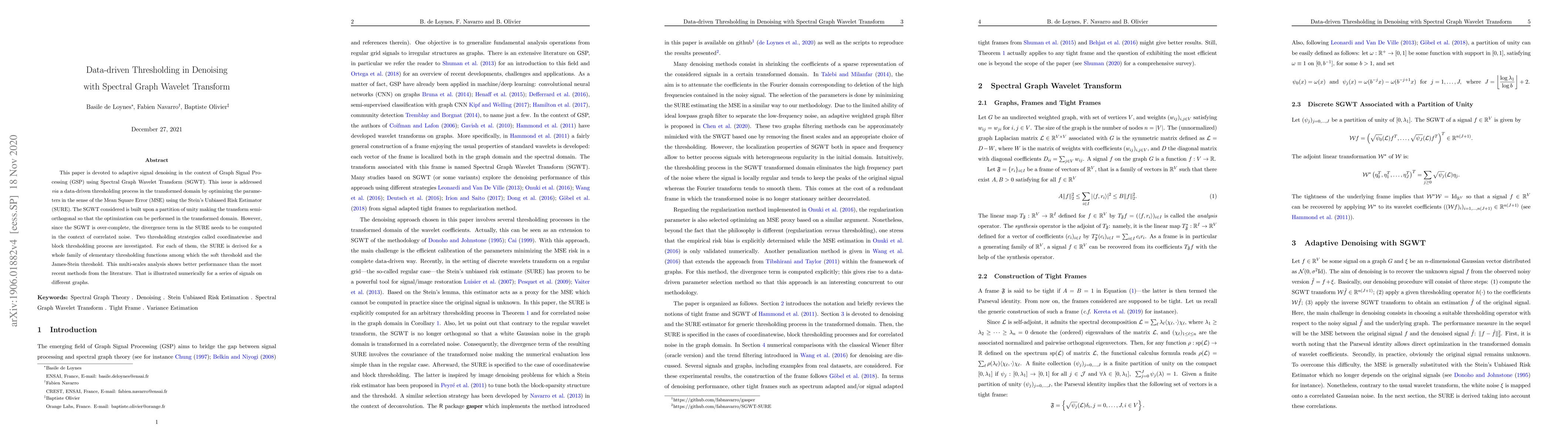 This paper presents an adaptive signal denoising method using Spectral Graph Wavelet Transform (SGWT) with a data-driven thresholding process that optimizes parameters for Mean Square Error (MSE). The method outperforms previous methods in multi-scale analysis, illustrating its effectiveness in noise reduction.