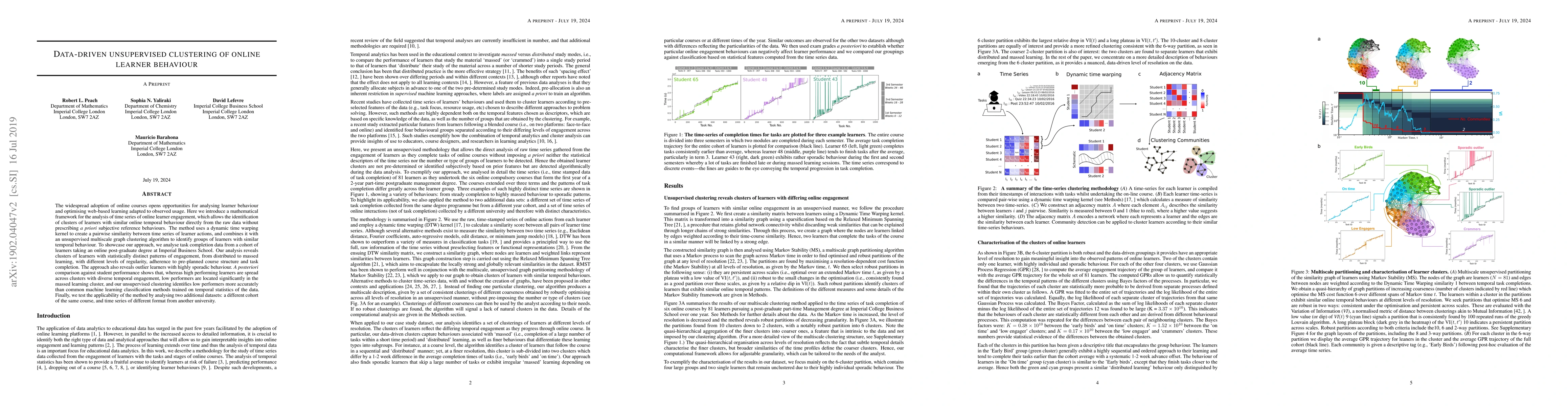 The widespread adoption of online courses opens opportunities for the analysis of learner behaviour and for the optimisation of web-based material adapted to observed usage. Here we introduce a mathematical framework for the analysis of time series collected from online engagement of learners, which allows the identification of clusters of learners with similar online behaviour directly from the data, i.e., the groups of learners are not pre-determined subjectively but emerge algorithmically from the analysis and the data.The method uses a dynamic time warping kernel to create a pairwise similarity between time series of learner actions, and combines it with an unsupervised multiscale graph clustering algorithm to cluster groups of learners with similar patterns of behaviour. We showcase our approach on online engagement data of adult learners taking six web-based courses as part of a post-graduate degree at Imperial Business School. Our analysis identifies clusters of learners with statistically distinct patterns of engagement, ranging from distributed to massed learning, with different levels of adherence to pre-planned course structure and/or task completion, and also revealing outlier learners with highly sporadic behaviour. A posteriori comparison with performance showed that, although the majority of low-performing learners are part of in the massed learning cluster, the high performing learners are distributed across clusters with different traits of online engagement. We also show that our methodology is able to identify low performing learners more accurately than common classification methods based on raw statistics extracted from the data.