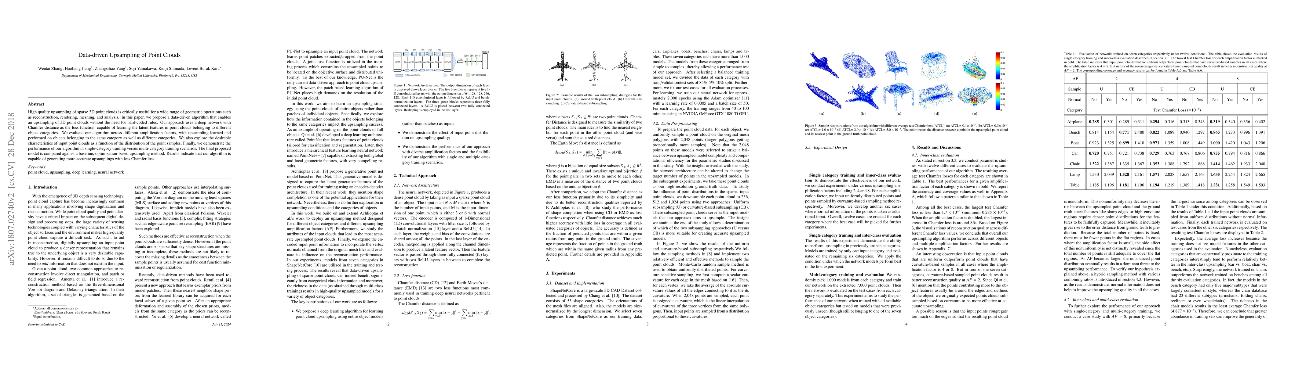 This paper proposes a data-driven deep learning algorithm for upsampling sparse 3D point clouds, using a deep network with Chamfer distance as the loss function. The method outperforms a baseline optimization-based approach, generating more uniform and accurate upsamplings across various amplification factors and object categories.