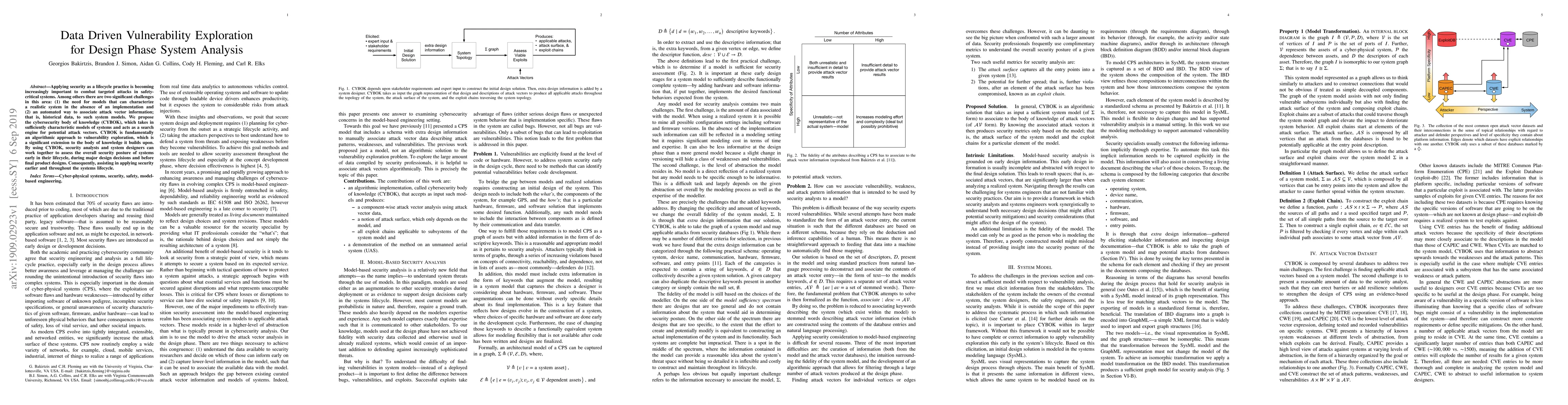 Applying security as a lifecycle practice is becoming increasingly important to combat targeted attacks in safety-critical systems. Among others there are two significant challenges in this area: (1) the need for models that can characterize a realistic system in the absence of an implementation and (2) an automated way to associate attack vector information; that is, historical data, to such system models. We propose the cybersecurity body of knowledge (CYBOK), which takes in sufficiently characteristic models of systems and acts as a search engine for potential attack vectors. CYBOK is fundamentally an algorithmic approach to vulnerability exploration, which is a significant extension to the body of knowledge it builds upon. By using CYBOK, security analysts and system designers can work together to assess the overall security posture of systems early in their lifecycle, during major design decisions and before final product designs. Consequently, assisting in applying security earlier and throughout the systems lifecycle.