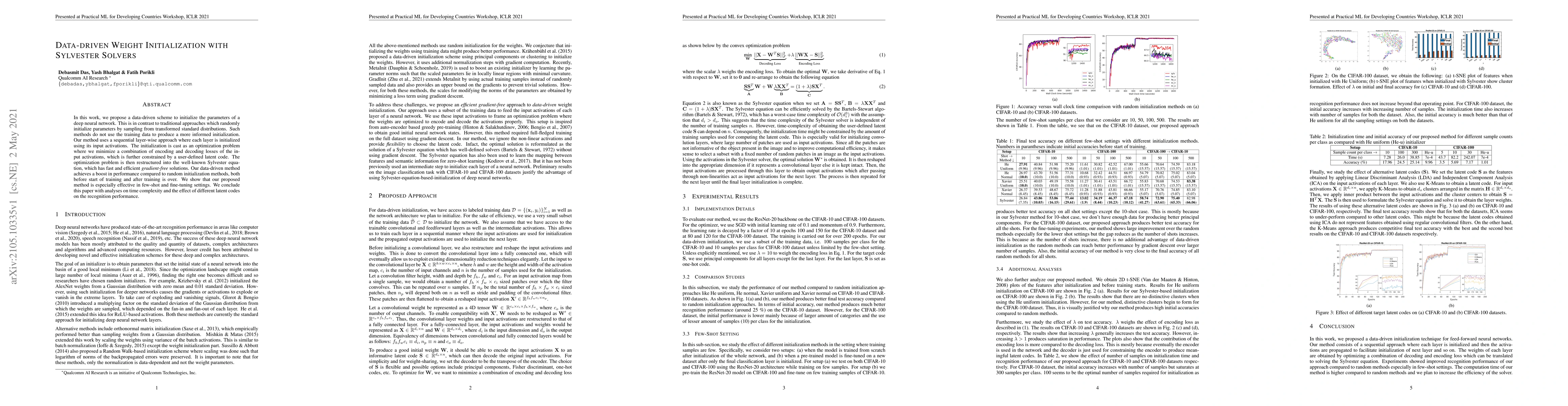 In this work, we propose a data-driven scheme to initialize the parameters of a deep neural network. This is in contrast to traditional approaches which randomly initialize parameters by sampling from transformed standard distributions. Such methods do not use the training data to produce a more informed initialization. Our method uses a sequential layer-wise approach where each layer is initialized using its input activations. The initialization is cast as an optimization problem where we minimize a combination of encoding and decoding losses of the input activations, which is further constrained by a user-defined latent code. The optimization problem is then restructured into the well-known Sylvester equation, which has fast and efficient gradient-free solutions. Our data-driven method achieves a boost in performance compared to random initialization methods, both before start of training and after training is over. We show that our proposed method is especially effective in few-shot and fine-tuning settings. We conclude this paper with analyses on time complexity and the effect of different latent codes on the recognition performance.