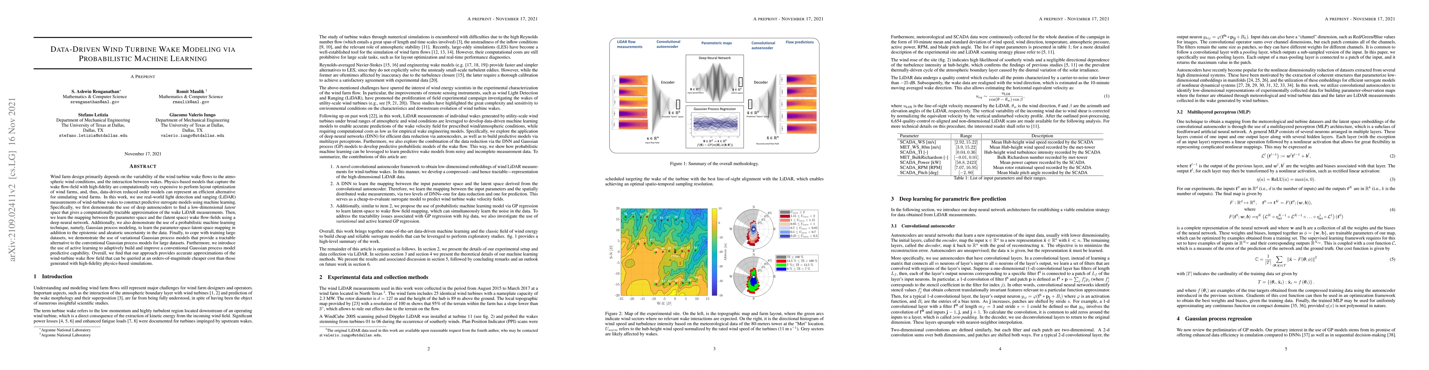 Wind farm design primarily depends on the variability of the wind turbine wake flows to the atmospheric wind conditions, and the interaction between wakes. Physics-based models that capture the wake flow-field with high-fidelity are computationally very expensive to perform layout optimization of wind farms, and, thus, data-driven reduced order models can represent an efficient alternative for simulating wind farms. In this work, we use real-world light detection and ranging (LiDAR) measurements of wind-turbine wakes to construct predictive surrogate models using machine learning. Specifically, we first demonstrate the use of deep autoencoders to find a low-dimensional \emph{latent} space that gives a computationally tractable approximation of the wake LiDAR measurements. Then, we learn the mapping between the parameter space and the (latent space) wake flow-fields using a deep neural network. Additionally, we also demonstrate the use of a probabilistic machine learning technique, namely, Gaussian process modeling, to learn the parameter-space-latent-space mapping in addition to the epistemic and aleatoric uncertainty in the data. Finally, to cope with training large datasets, we demonstrate the use of variational Gaussian process models that provide a tractable alternative to the conventional Gaussian process models for large datasets. Furthermore, we introduce the use of active learning to adaptively build and improve a conventional Gaussian process model predictive capability. Overall, we find that our approach provides accurate approximations of the wind-turbine wake flow field that can be queried at an orders-of-magnitude cheaper cost than those generated with high-fidelity physics-based simulations.