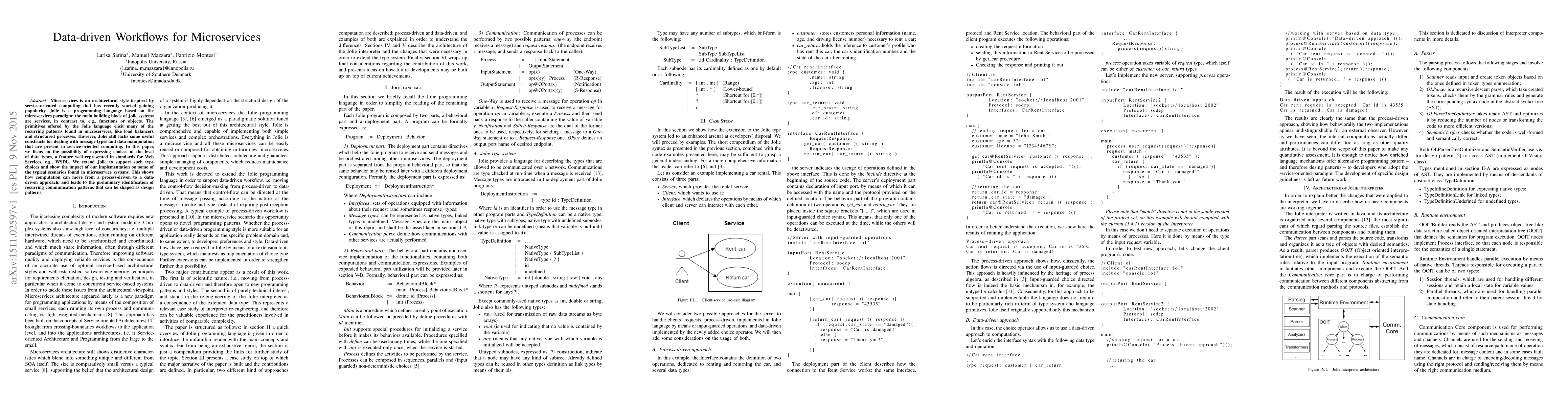 This paper extends the Jolie programming language to support data-driven workflows in microservices by introducing constructs for expressing choices at the level of data types, similar to WSDL in Web Services. The implementation demonstrates a shift from process-driven to data-driven computation and identifies recurring communication patterns as design patterns.