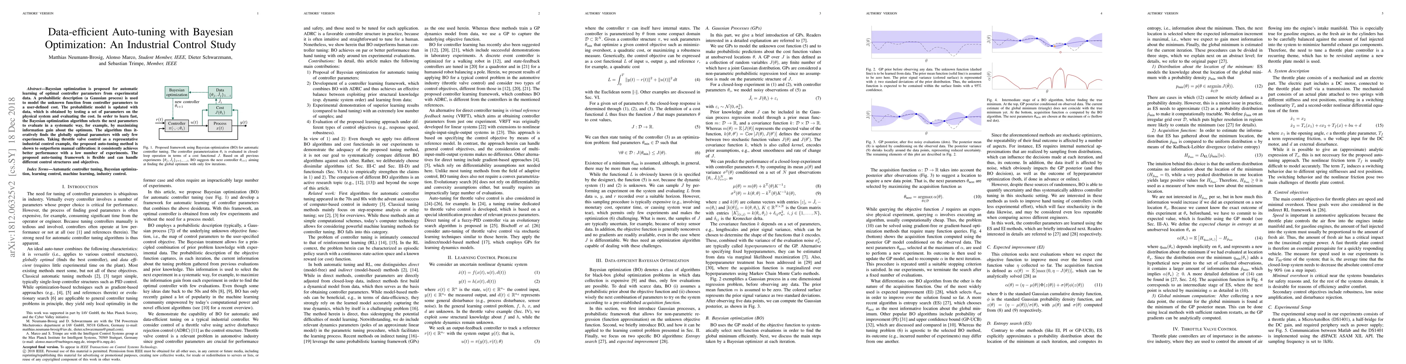 This paper proposes a data-efficient auto-tuning method using Bayesian optimization for learning optimal controller parameters, demonstrating its effectiveness in industrial control through throttle valve control. The method outperforms manual calibration by achieving better performance with fewer experiments.