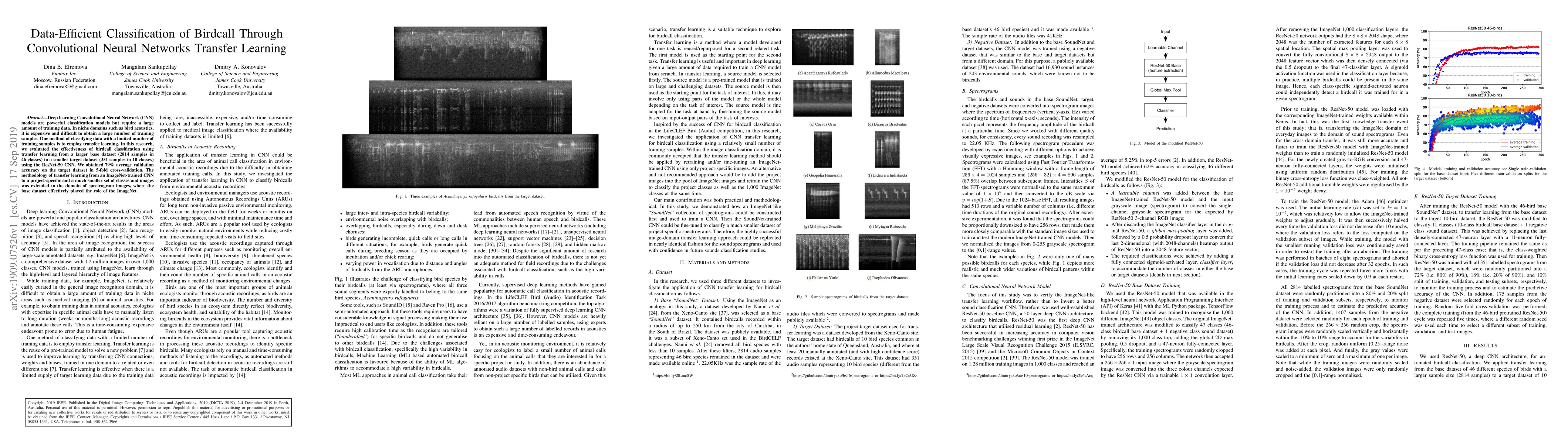 This research explores the use of transfer learning with ResNet-50 CNNs to classify birdcalls from limited training data, achieving 79% average validation accuracy on a smaller target dataset. The methodology extends transfer learning from ImageNet-trained models to spectrogram images for niche classification tasks.