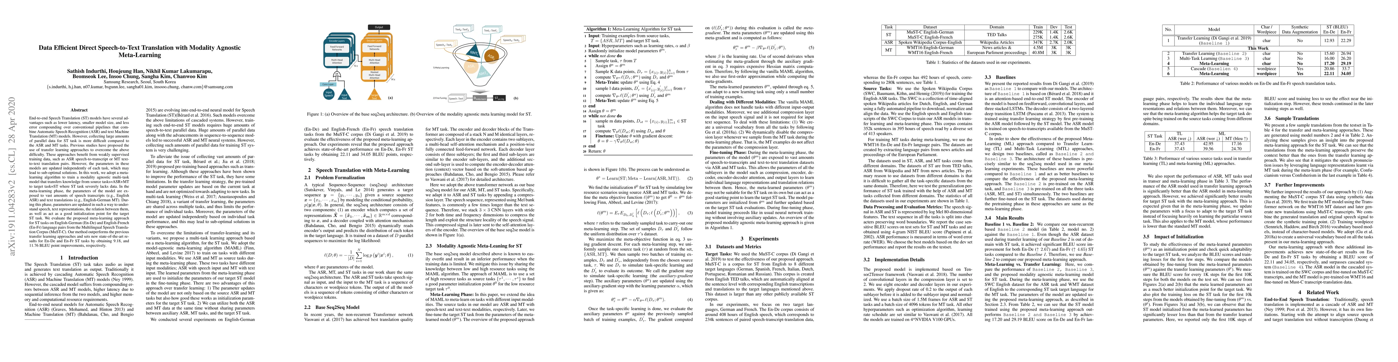 This paper proposes a meta-learning approach to train a modality agnostic multi-task model for data-efficient direct speech-to-text translation, leveraging weakly supervised data from ASR and MT tasks. The method achieves state-of-the-art results on English-German and English-French speech-to-text translation, with significant BLEU score improvements.