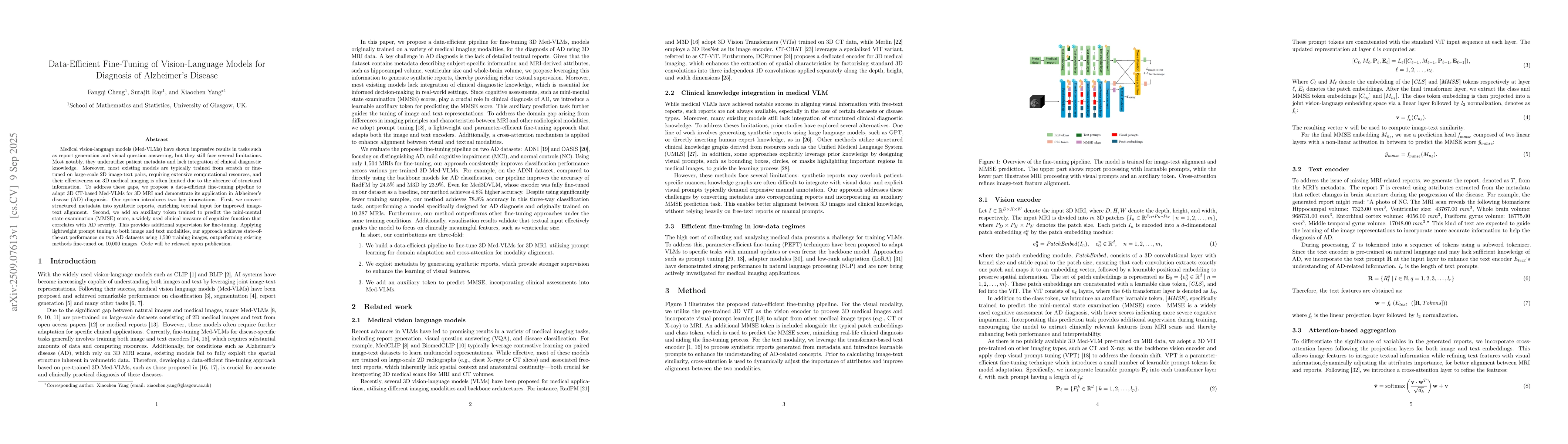 Medical vision-language models (Med-VLMs) have shown impressive results in tasks such as report generation and visual question answering, but they still face several limitations. Most notably, they underutilize patient metadata and lack integration of clinical diagnostic knowledge. Moreover, most existing models are typically trained from scratch or fine-tuned on large-scale 2D image-text pairs, requiring extensive computational resources, and their effectiveness on 3D medical imaging is often limited due to the absence of structural information. To address these gaps, we propose a data-efficient fine-tuning pipeline to adapt 3D CT-based Med-VLMs for 3D MRI and demonstrate its application in Alzheimer's disease (AD) diagnosis. Our system introduces two key innovations. First, we convert structured metadata into synthetic reports, enriching textual input for improved image-text alignment. Second, we add an auxiliary token trained to predict the mini-mental state examination (MMSE) score, a widely used clinical measure of cognitive function that correlates with AD severity. This provides additional supervision for fine-tuning. Applying lightweight prompt tuning to both image and text modalities, our approach achieves state-of-the-art performance on two AD datasets using 1,500 training images, outperforming existing methods fine-tuned on 10,000 images. Code will be released upon publication.