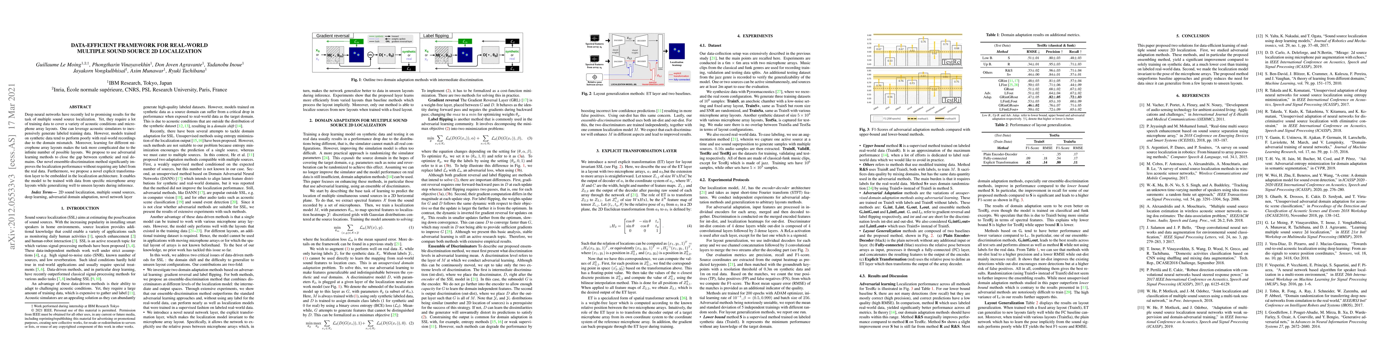 This paper proposes a data-efficient framework for real-world multiple sound source localization using adversarial learning to bridge the gap between synthetic and real-world data. It introduces an ensemble-discrimination method and a transformation layer to enhance performance without requiring real-world labels and to generalize across different microphone array layouts.