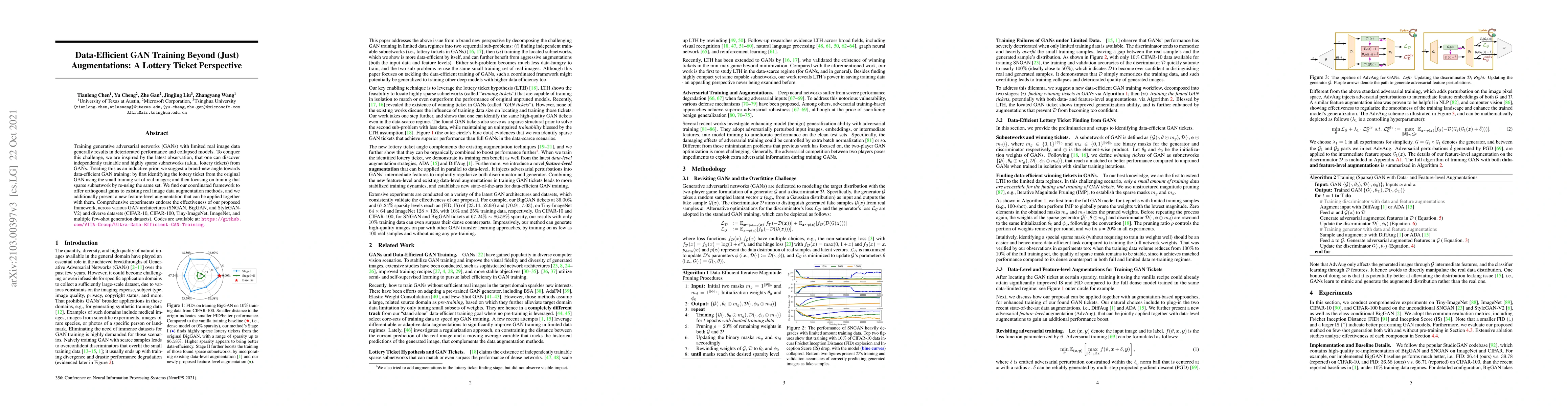 This paper proposes a novel framework for data-efficient GAN training by identifying and training sparse subnetworks (lottery tickets) from GANs using limited real image data. The approach offers orthogonal gains to existing data augmentation methods and includes a new feature-level augmentation technique. Experiments across various GAN architectures and datasets demonstrate its effectiveness.