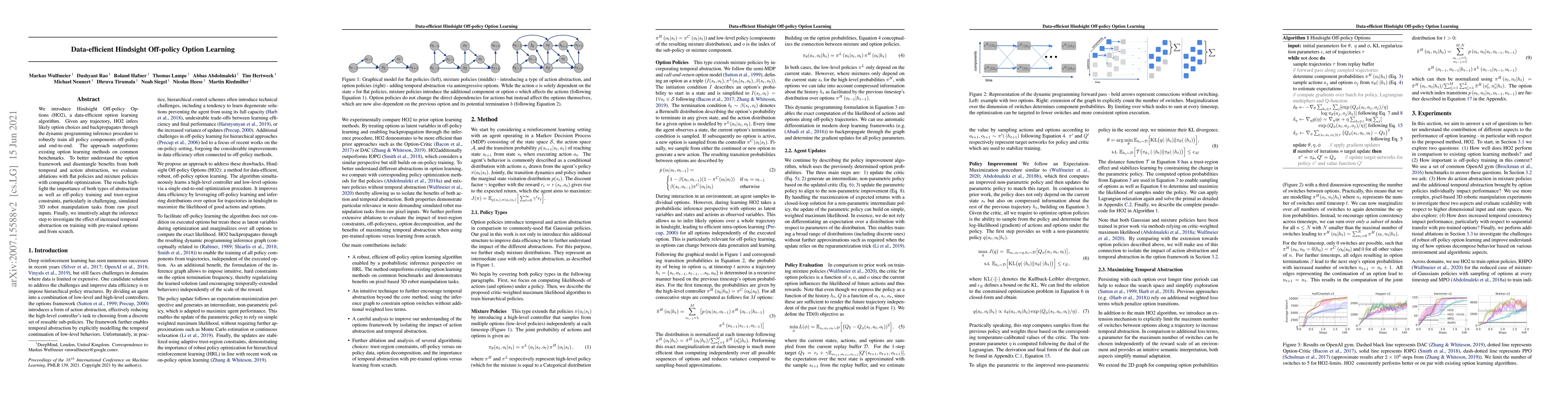 We introduce Hindsight Off-policy Options (HO2), a data-efficient option learning algorithm. Given any trajectory, HO2 infers likely option choices and backpropagates through the dynamic programming inference procedure to robustly train all policy components off-policy and end-to-end. The approach outperforms existing option learning methods on common benchmarks. To better understand the option framework and disentangle benefits from both temporal and action abstraction, we evaluate ablations with flat policies and mixture policies with comparable optimization. The results highlight the importance of both types of abstraction as well as off-policy training and trust-region constraints, particularly in challenging, simulated 3D robot manipulation tasks from raw pixel inputs. Finally, we intuitively adapt the inference step to investigate the effect of increased temporal abstraction on training with pre-trained options and from scratch.