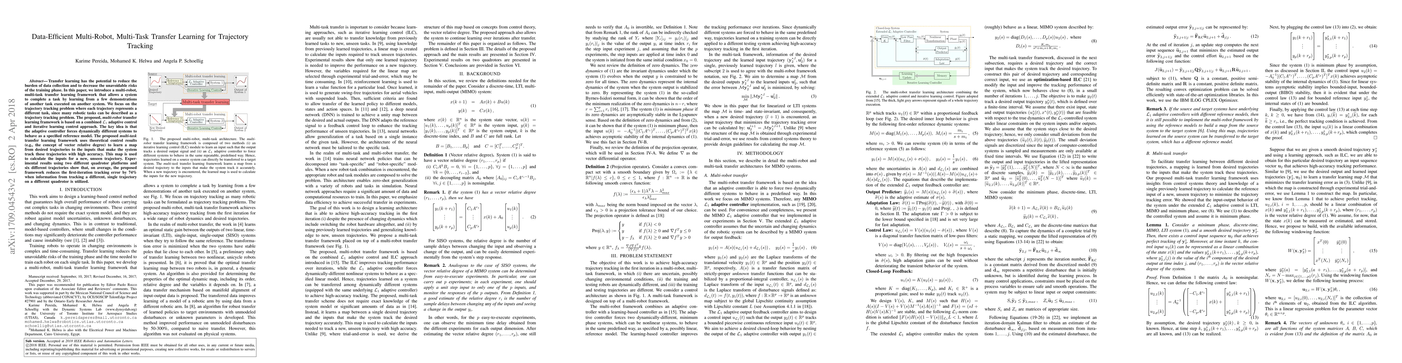 Transfer learning has the potential to reduce the burden of data collection and to decrease the unavoidable risks of the training phase. In this letter, we introduce a multirobot, multitask transfer learning framework that allows a system to complete a task by learning from a few demonstrations of another task executed on another system. We focus on the trajectory tracking problem where each trajectory represents a different task, since many robotic tasks can be described as a trajectory tracking problem. The proposed multirobot transfer learning framework is based on a combined $\mathcal{L}_1$ adaptive control and an iterative learning control approach. The key idea is that the adaptive controller forces dynamically different systems to behave as a specified reference model. The proposed multitask transfer learning framework uses theoretical control results (e.g., the concept of vector relative degree) to learn a map from desired trajectories to the inputs that make the system track these trajectories with high accuracy. This map is used to calculate the inputs for a new, unseen trajectory. Experimental results using two different quadrotor platforms and six different trajectories show that, on average, the proposed framework reduces the first-iteration tracking error by 74% when information from tracking a different single trajectory on a different quadrotor is utilized.
