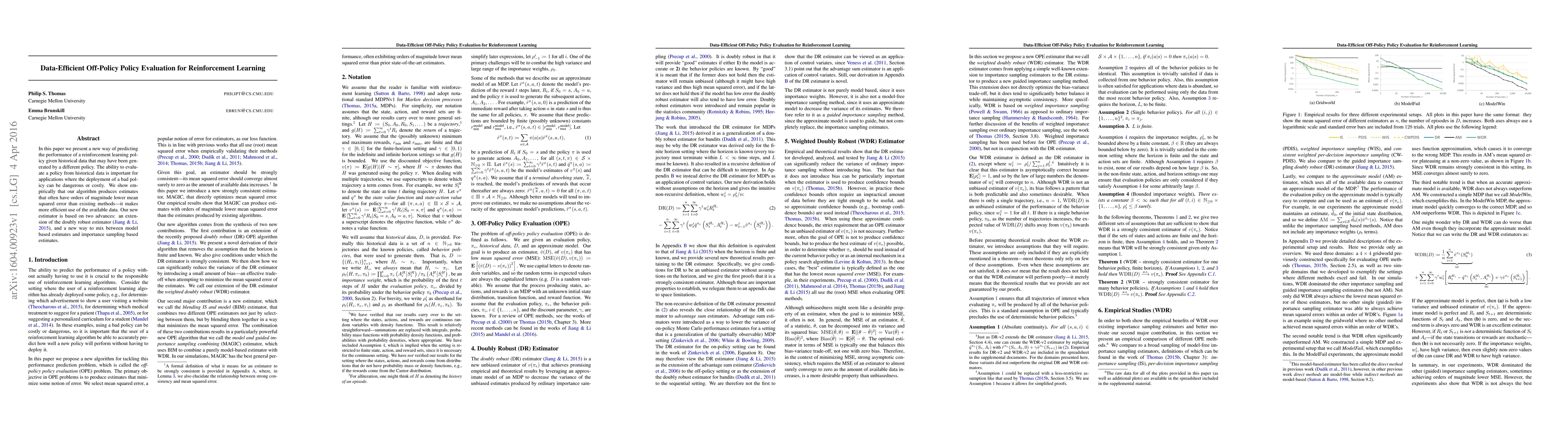 In this paper we present a new way of predicting the performance of a reinforcement learning policy given historical data that may have been generated by a different policy. The ability to evaluate a policy from historical data is important for applications where the deployment of a bad policy can be dangerous or costly. We show empirically that our algorithm produces estimates that often have orders of magnitude lower mean squared error than existing methods---it makes more efficient use of the available data. Our new estimator is based on two advances: an extension of the doubly robust estimator (Jiang and Li, 2015), and a new way to mix between model based estimates and importance sampling based estimates.