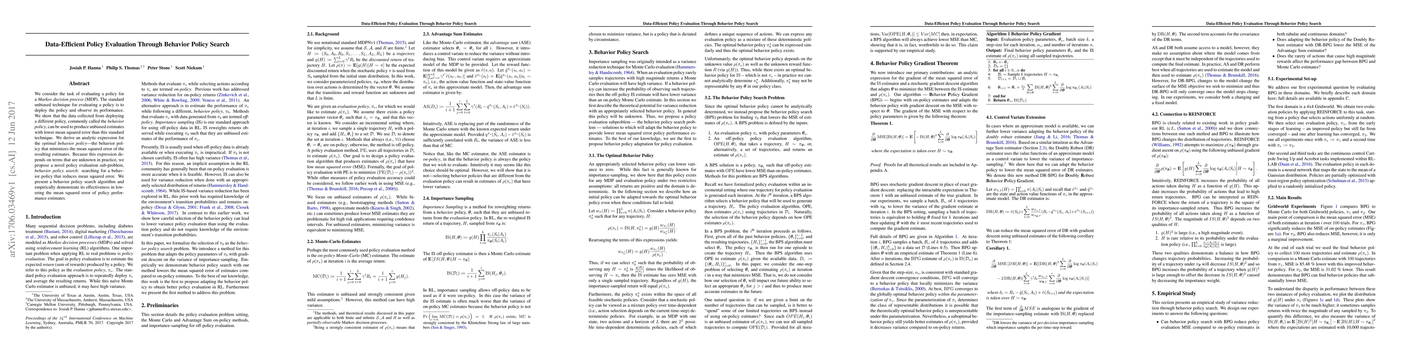 We consider the task of evaluating a policy for a Markov decision process (MDP). The standard unbiased technique for evaluating a policy is to deploy the policy and observe its performance. We show that the data collected from deploying a different policy, commonly called the behavior policy, can be used to produce unbiased estimates with lower mean squared error than this standard technique. We derive an analytic expression for the optimal behavior policy --- the behavior policy that minimizes the mean squared error of the resulting estimates. Because this expression depends on terms that are unknown in practice, we propose a novel policy evaluation sub-problem, behavior policy search: searching for a behavior policy that reduces mean squared error. We present a behavior policy search algorithm and empirically demonstrate its effectiveness in lowering the mean squared error of policy performance estimates.