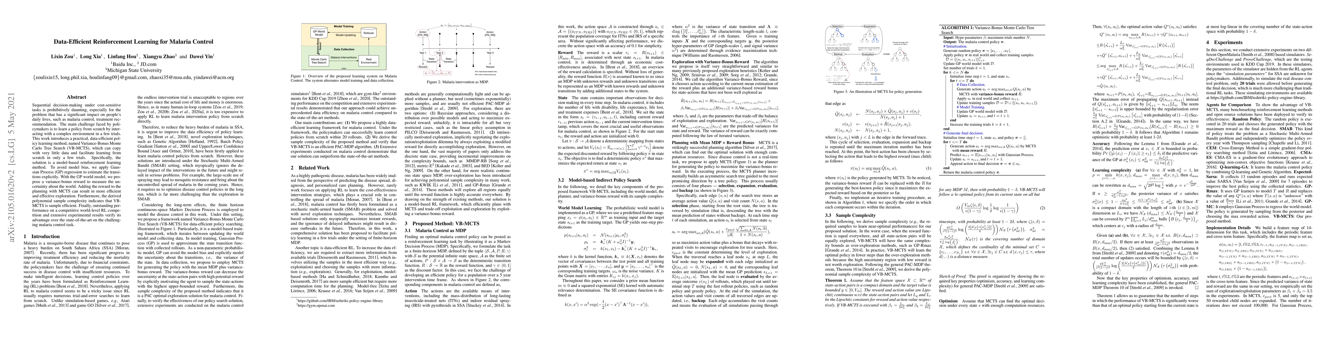 This paper introduces a data-efficient reinforcement learning method, Variance-Bonus Monte Carlo Tree Search (VB-MCTS), for malaria control treatment recommendations. It leverages Gaussian Process regression for a model-based approach and a variance-bonus reward to enhance exploration, demonstrating superior performance in a competitive RL competition.