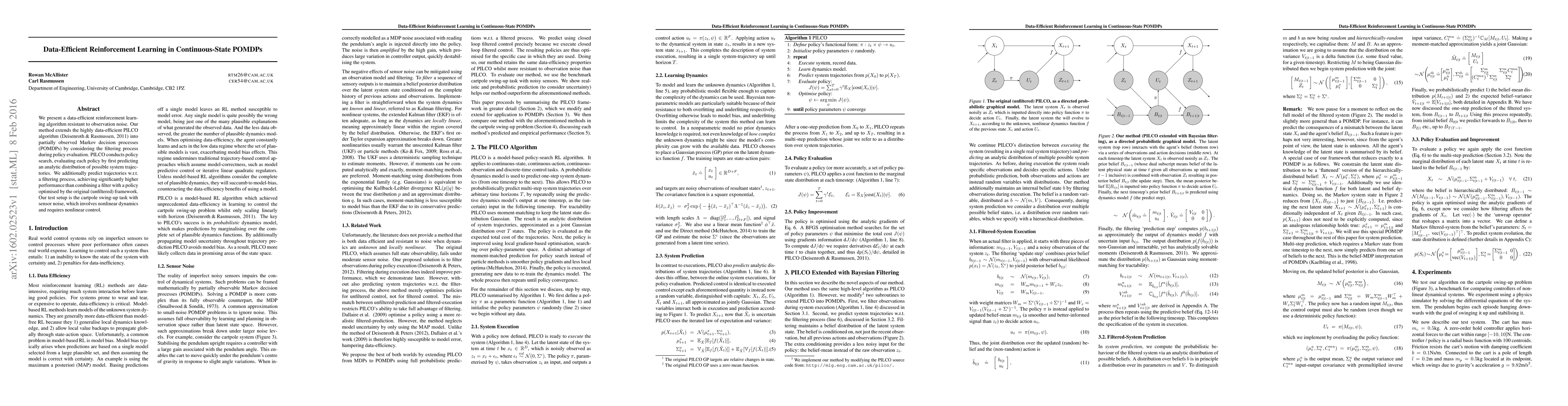This paper introduces a data-efficient reinforcement learning algorithm for continuous-state partially observed Markov decision processes (POMDPs), extending the PILCO method to incorporate filtering during policy evaluation. The proposed approach outperforms traditional methods by predicting system trajectories through both filtering and policy search.