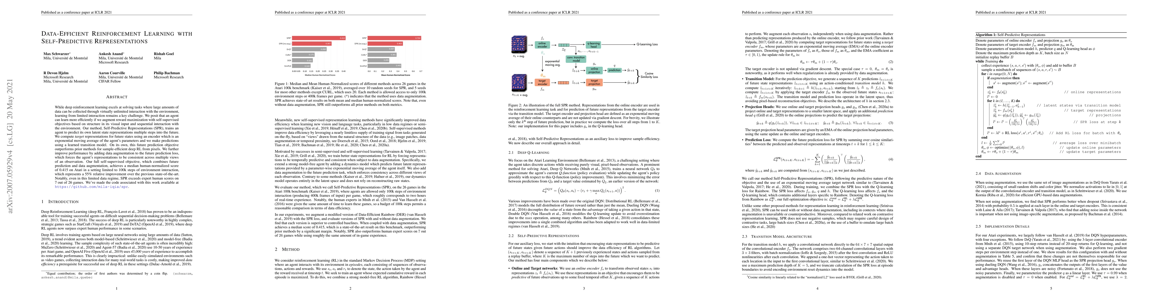 This paper introduces Self-Predictive Representations (SPR), a method for data-efficient reinforcement learning that combines self-supervised objectives with future state predictions to improve learning from limited data. SPR achieves a 55% relative improvement over the previous state-of-the-art on Atari games, reaching human-level performance in several tasks with only 100k training steps.