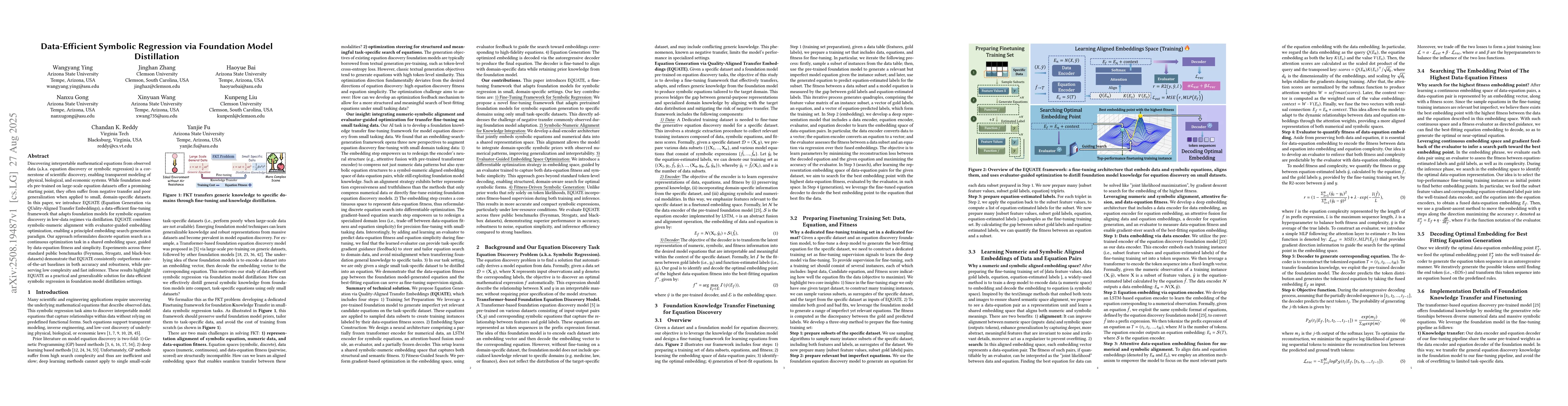 Discovering interpretable mathematical equations from observed data (a.k.a. equation discovery or symbolic regression) is a cornerstone of scientific discovery, enabling transparent modeling of physical, biological, and economic systems. While foundation models pre-trained on large-scale equation datasets offer a promising starting point, they often suffer from negative transfer and poor generalization when applied to small, domain-specific datasets. In this paper, we introduce EQUATE (Equation Generation via QUality-Aligned Transfer Embeddings), a data-efficient fine-tuning framework that adapts foundation models for symbolic equation discovery in low-data regimes via distillation. EQUATE combines symbolic-numeric alignment with evaluator-guided embedding optimization, enabling a principled embedding-search-generation paradigm. Our approach reformulates discrete equation search as a continuous optimization task in a shared embedding space, guided by data-equation fitness and simplicity. Experiments across three standard public benchmarks (Feynman, Strogatz, and black-box datasets) demonstrate that EQUATE consistently outperforms state-of-the-art baselines in both accuracy and robustness, while preserving low complexity and fast inference. These results highlight EQUATE as a practical and generalizable solution for data-efficient symbolic regression in foundation model distillation settings.