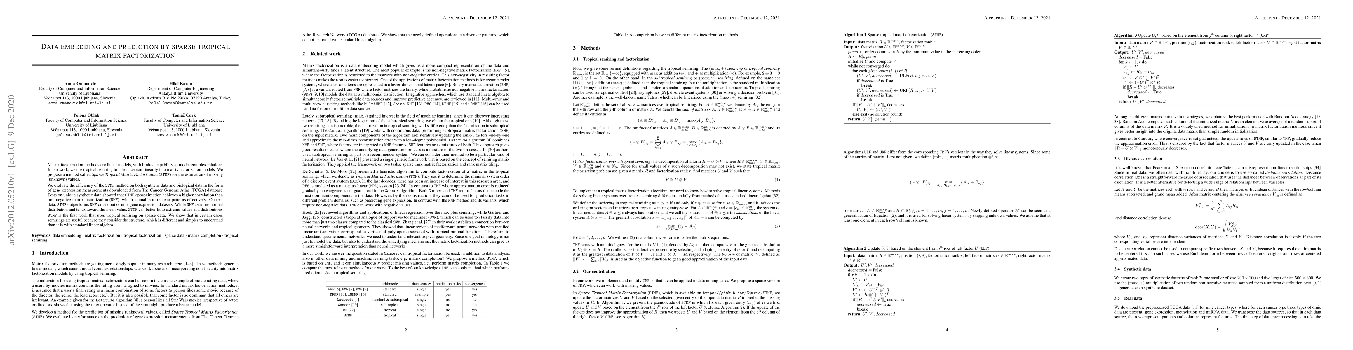 The research introduces Sparse Tropical Matrix Factorization (STMF) for estimating missing values in datasets, utilizing the tropical semiring to introduce non-linearity into matrix factorization models. The method is evaluated on synthetic and biological data, specifically gene expression measurements from The Cancer Genome Atlas (TCGA) database.