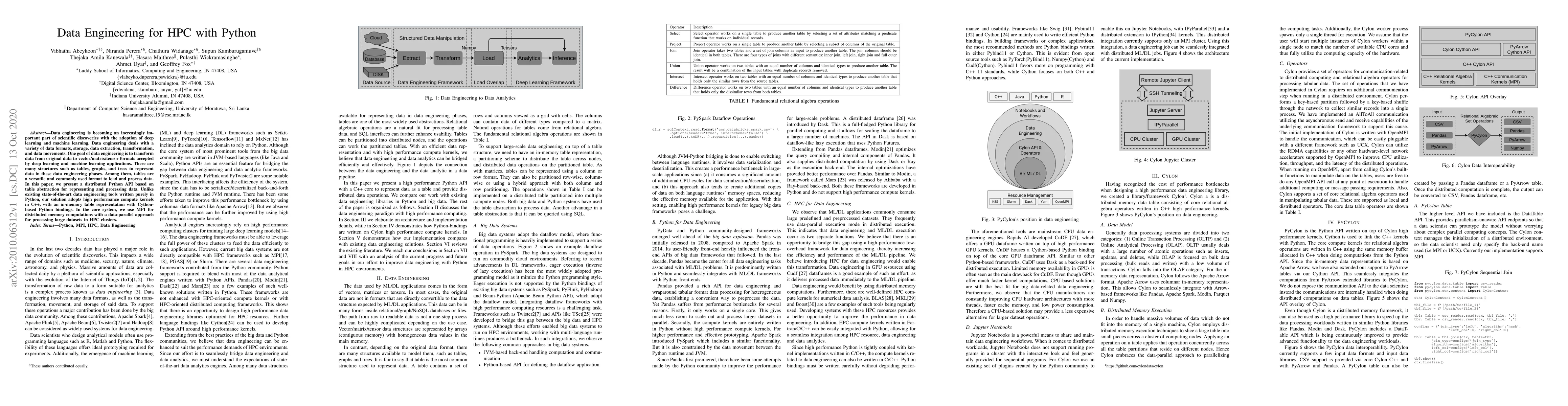This paper introduces a distributed Python API for data engineering in high-performance computing (HPC) environments, leveraging table abstractions for efficient data processing. It combines high-performance C++ kernels with Cython-based Python bindings and MPI for distributed memory computations to handle large datasets effectively.