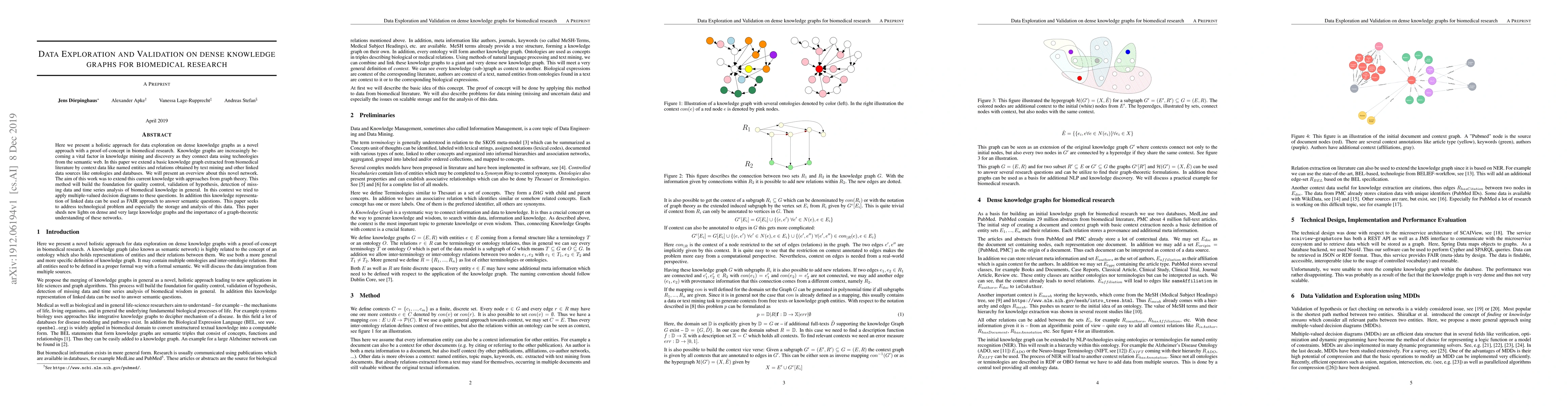 This paper introduces a novel approach for data exploration and validation on dense knowledge graphs in biomedical research, extending existing knowledge graphs with context data and linked data sources. The method aims to enhance quality control, hypothesis validation, and data analysis using graph theory and multiple-valued decision diagrams, promoting FAIR data representation.