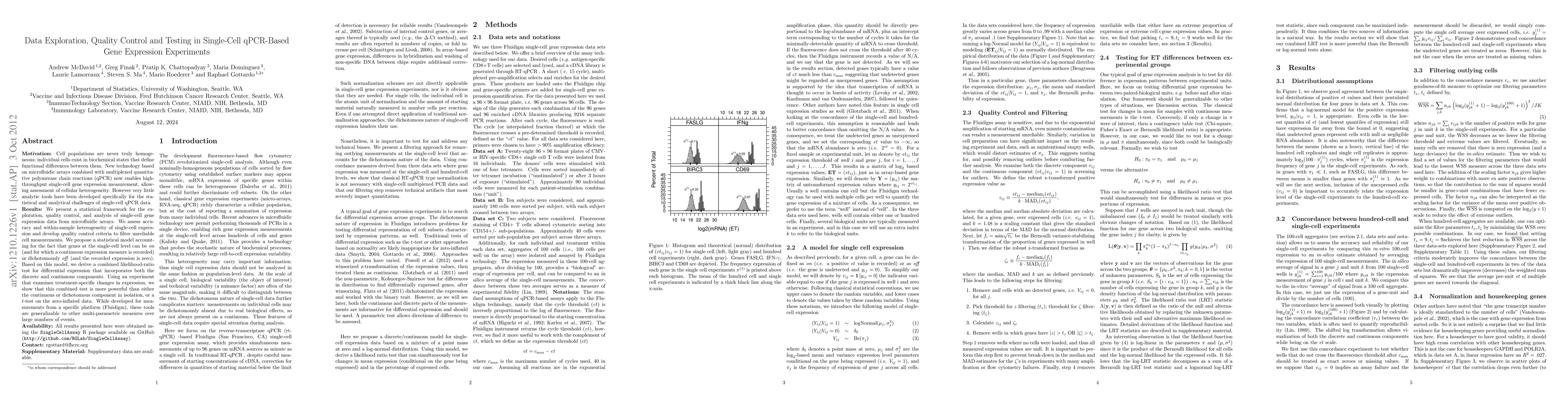 This paper introduces a statistical framework for analyzing single-cell gene expression data from microfluidic arrays, focusing on data exploration, quality control, and testing. It proposes a model to handle the mixed continuous and discrete nature of single-cell qPCR data, and demonstrates a combined likelihood-ratio test that is more powerful than traditional methods for assessing differential expression.