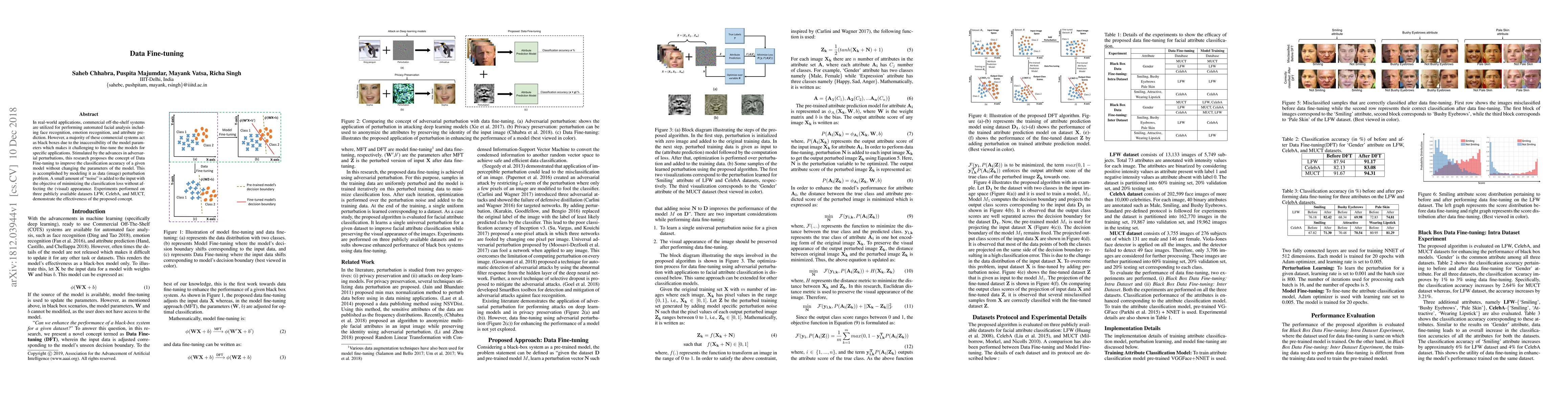 In real-world applications, commercial off-the-shelf systems are utilized for performing automated facial analysis including face recognition, emotion recognition, and attribute prediction. However, a majority of these commercial systems act as black boxes due to the inaccessibility of the model parameters which makes it challenging to fine-tune the models for specific applications. Stimulated by the advances in adversarial perturbations, this research proposes the concept of Data Fine-tuning to improve the classification accuracy of a given model without changing the parameters of the model. This is accomplished by modeling it as data (image) perturbation problem. A small amount of "noise" is added to the input with the objective of minimizing the classification loss without affecting the (visual) appearance. Experiments performed on three publicly available datasets LFW, CelebA, and MUCT, demonstrate the effectiveness of the proposed concept.
