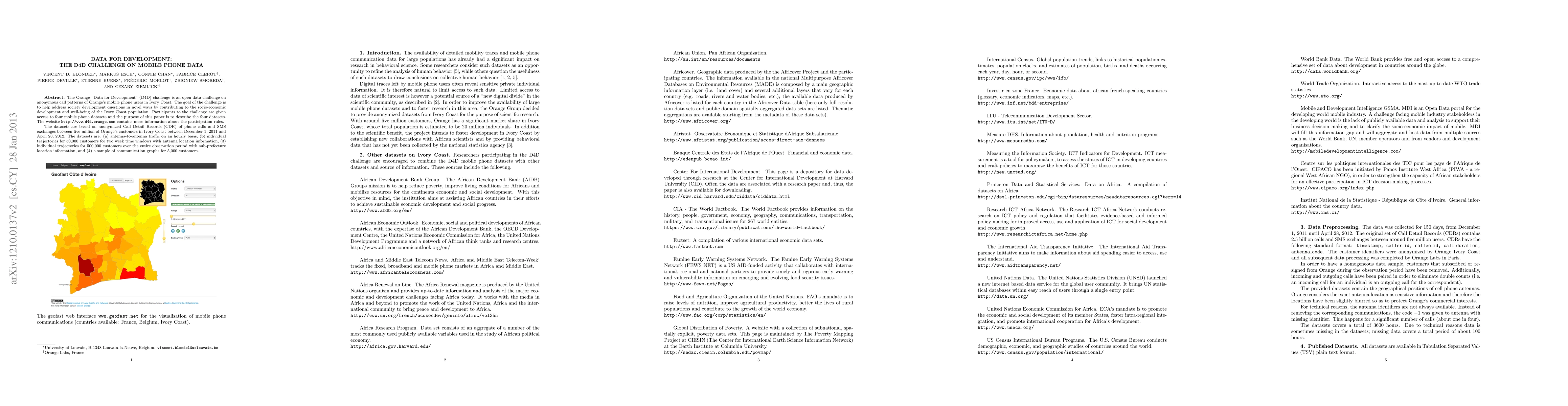 The D4D challenge provides anonymized mobile phone data from Ivory Coast to address socio-economic development questions, featuring four datasets: hourly antenna-to-antenna traffic, individual customer trajectories, and communication graphs. The datasets aim to contribute to the well-being of Ivory Coast's population.