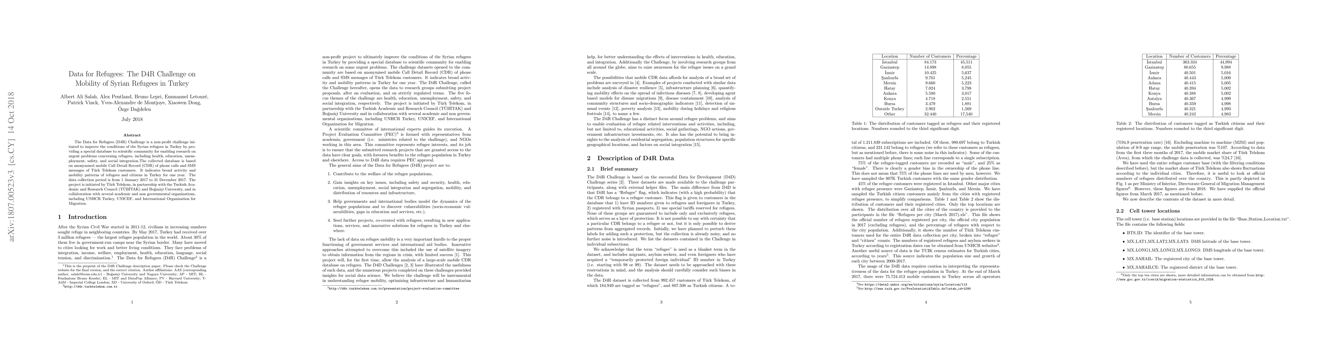 The Data for Refugees (D4R) Challenge is a non-profit challenge initiated to improve the conditions of the Syrian refugees in Turkey by providing a special database to scientific community for enabling research on urgent problems concerning refugees, including health, education, unemployment, safety, and social integration. The collected database is based on anonymised mobile Call Detail Record (CDR) of phone calls and SMS messages from one million Turk Telekom customers. It indicates broad activity and mobility patterns of refugees and citizens in Turkey for one year. The data collection period is from 1 January 2017 to 31 December 2017. The project is initiated by Turk Telekom, in partnership with the Turkish Academic and Research Council (TUBITAK) and Bogazici University, and in collaboration with several academic and non-governmental organizations, including UNHCR Turkey, UNICEF, and International Organization for Migration.