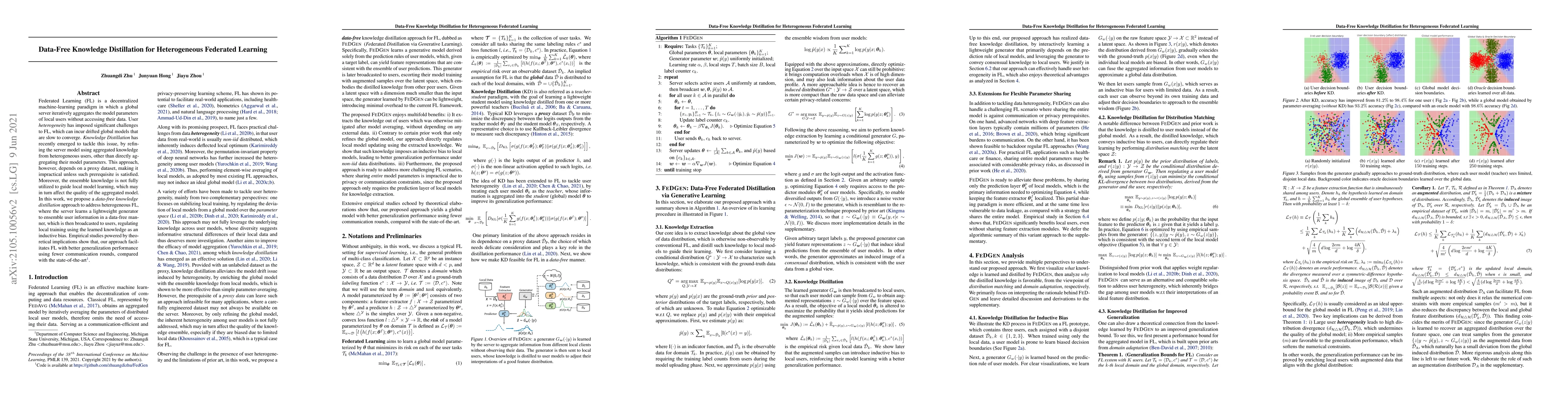 This paper proposes a data-free knowledge distillation method to enhance heterogeneous federated learning, where the server uses a lightweight generator to aggregate user information without requiring a proxy dataset. This approach improves generalization performance and reduces communication rounds compared to existing methods.