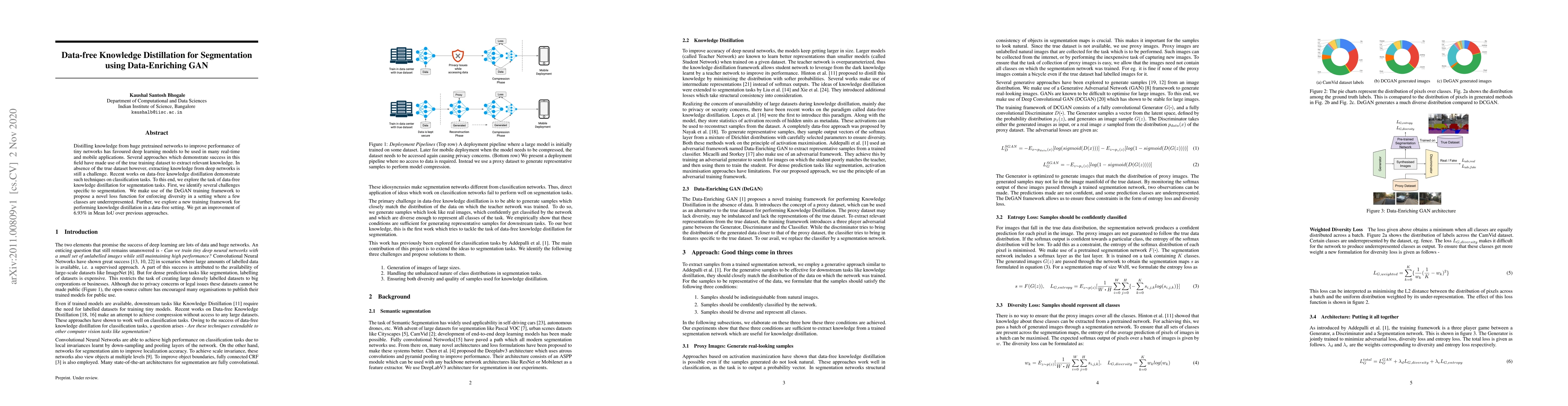 Distilling knowledge from huge pre-trained networks to improve the performance of tiny networks has favored deep learning models to be used in many real-time and mobile applications. Several approaches that demonstrate success in this field have made use of the true training dataset to extract relevant knowledge. In absence of the True dataset, however, extracting knowledge from deep networks is still a challenge. Recent works on data-free knowledge distillation demonstrate such techniques on classification tasks. To this end, we explore the task of data-free knowledge distillation for segmentation tasks. First, we identify several challenges specific to segmentation. We make use of the DeGAN training framework to propose a novel loss function for enforcing diversity in a setting where a few classes are underrepresented. Further, we explore a new training framework for performing knowledge distillation in a data-free setting. We get an improvement of 6.93% in Mean IoU over previous approaches.