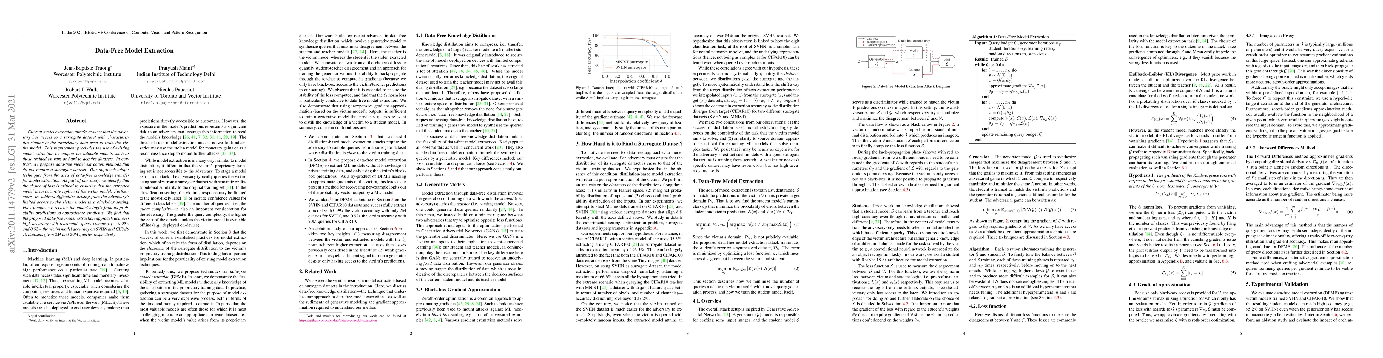 This paper proposes data-free model extraction techniques that do not require a surrogate dataset, enabling attacks on models trained on rare data. The method leverages knowledge transfer and recovers logits from the victim model's predictions to approximate gradients, achieving high accuracy with reasonable query complexity.