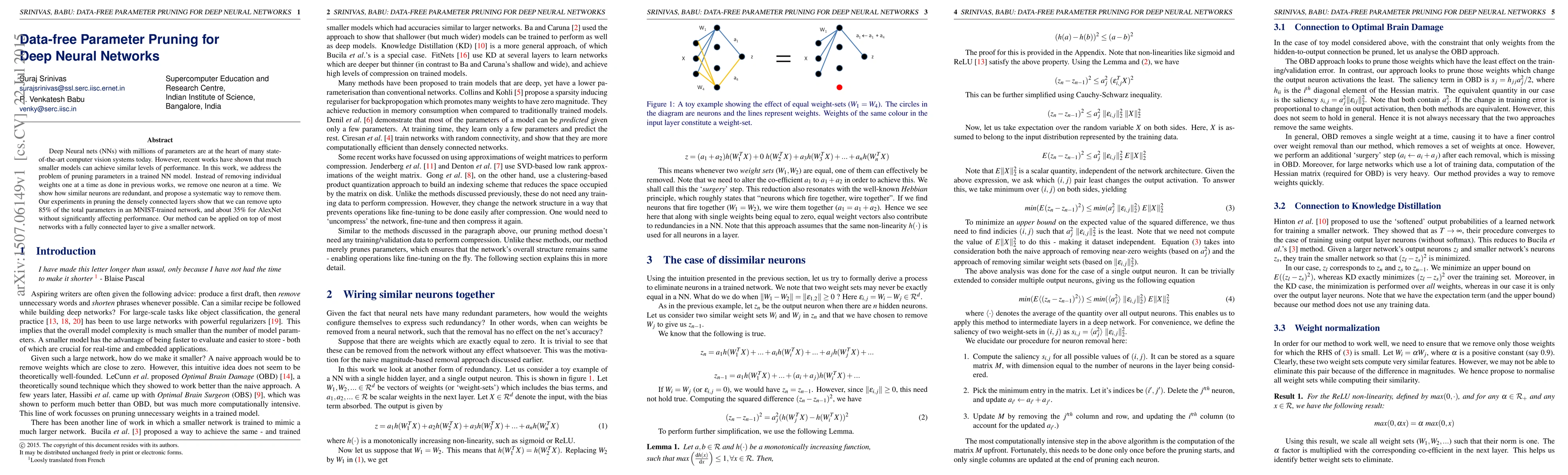 This paper proposes a data-free method for pruning neurons in deep neural networks to reduce parameters without significant performance loss. By systematically removing redundant neurons instead of individual weights, the authors demonstrate up to 85% parameter reduction in MNIST networks and 35% in AlexNet.